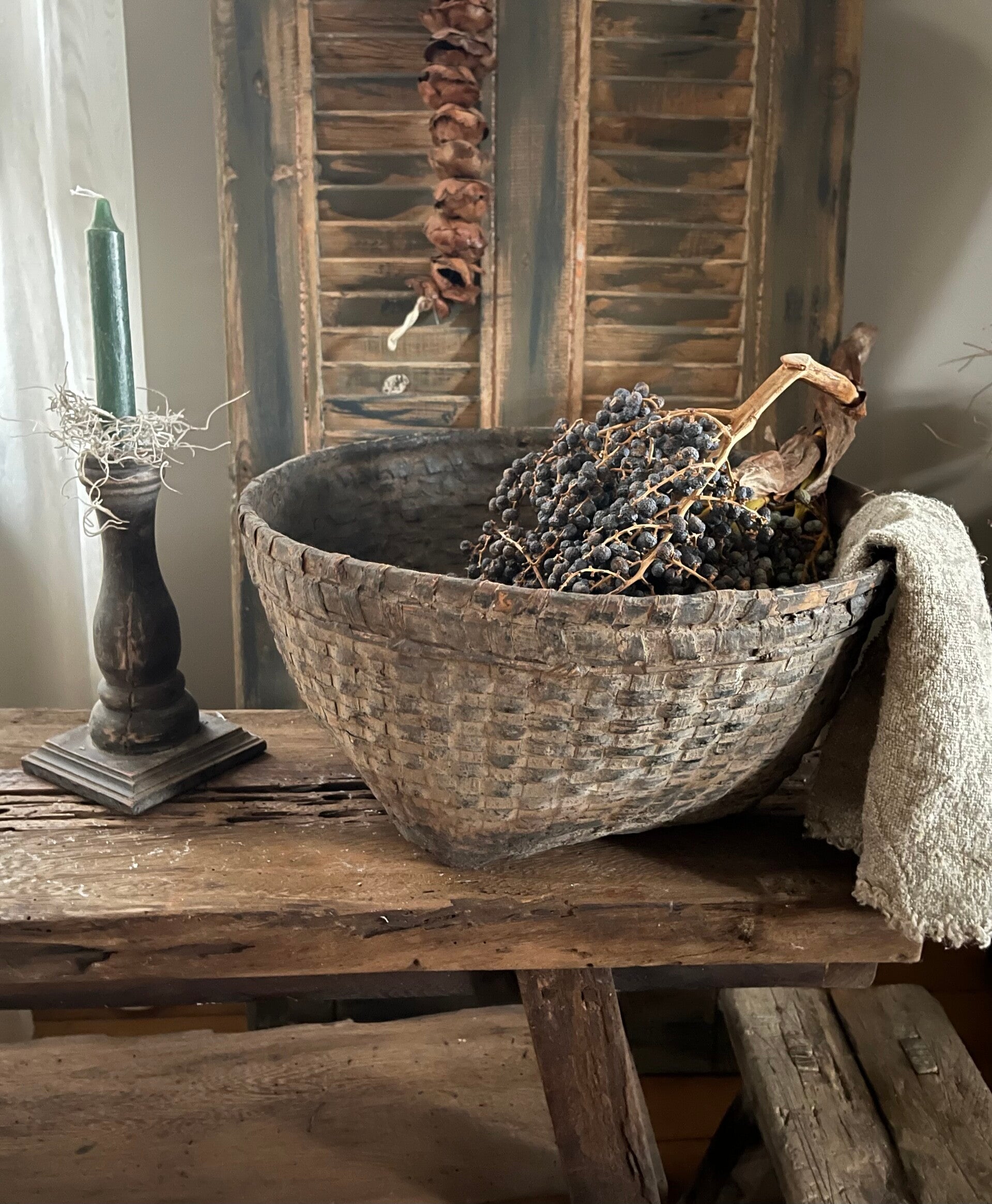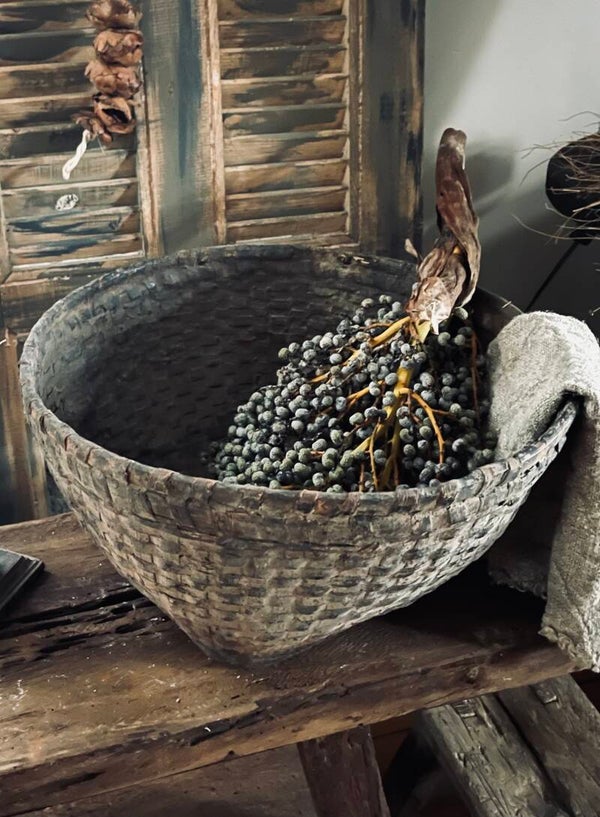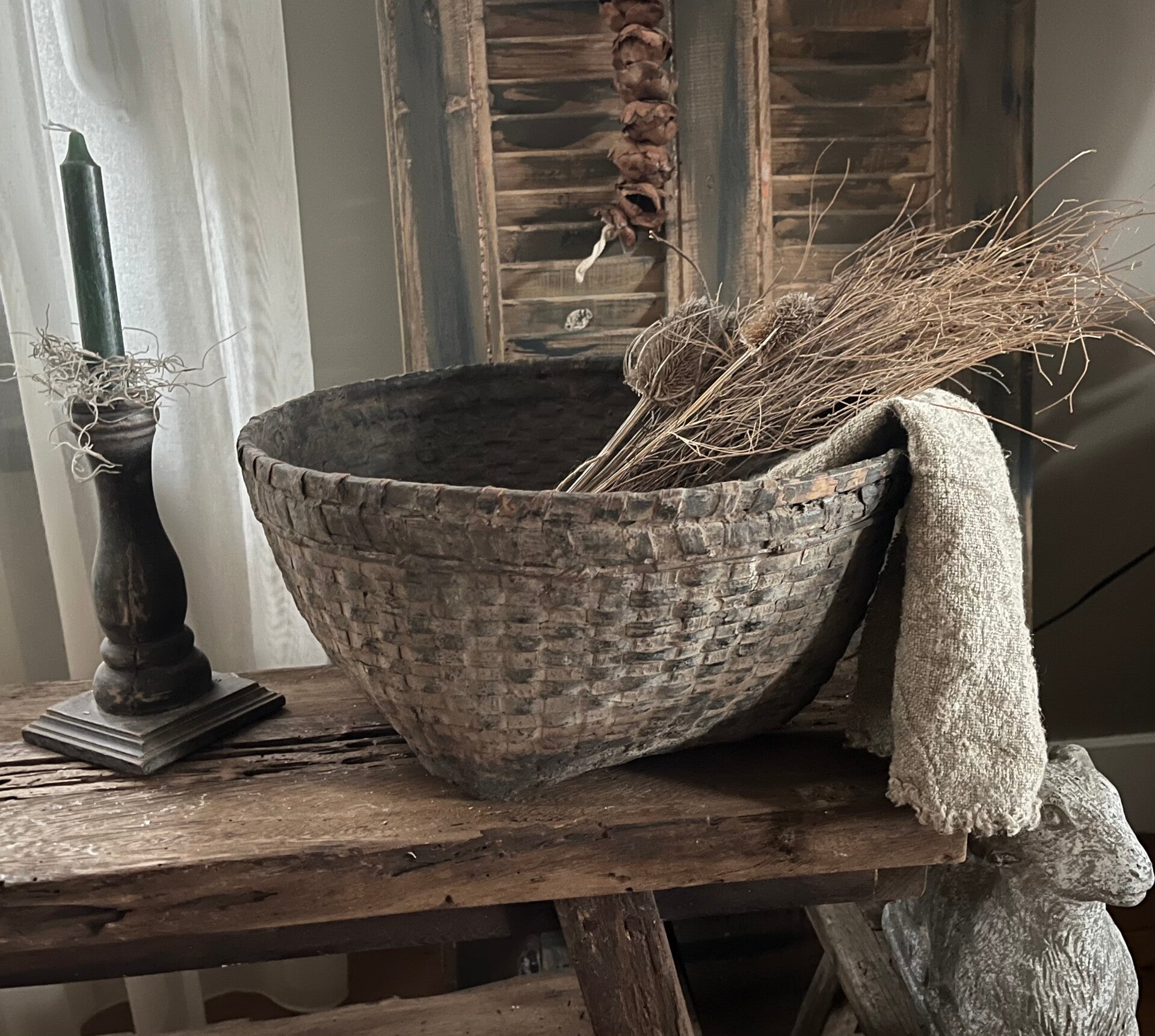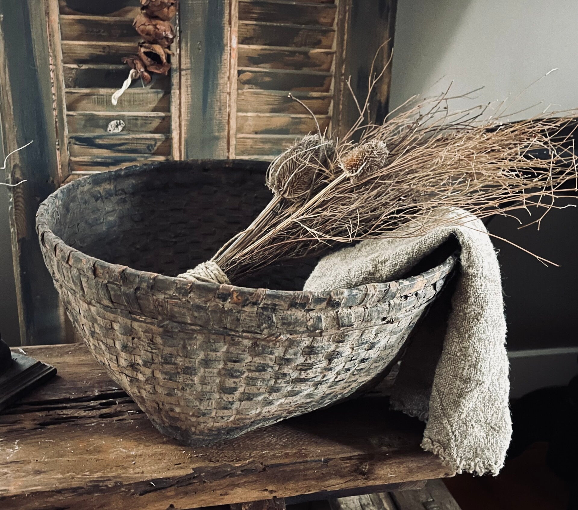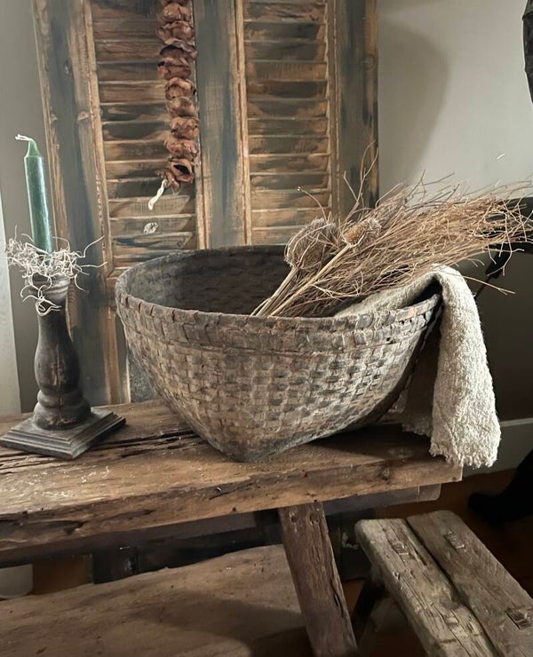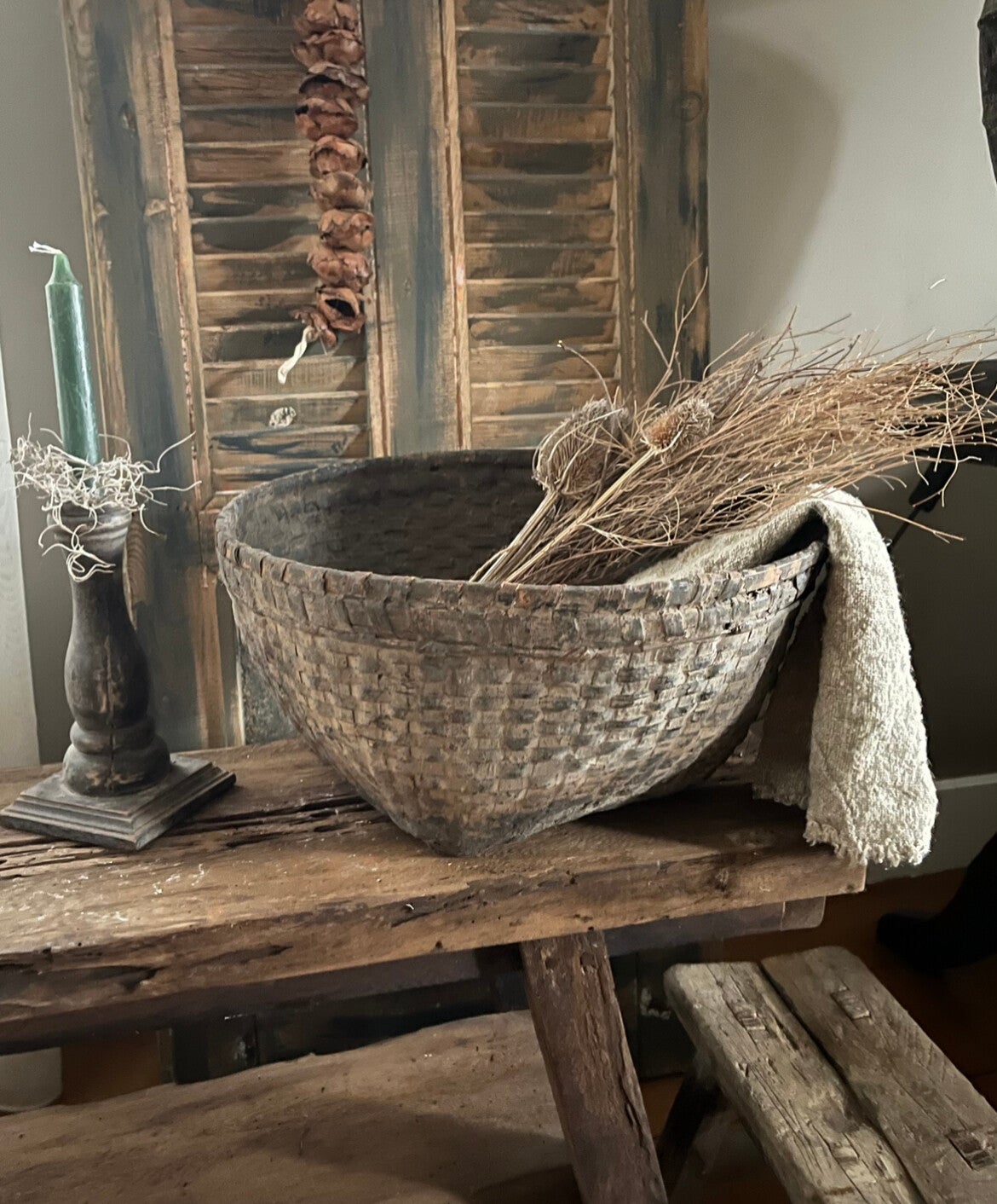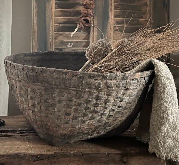 Het verouderde leem en riet inclusief de gebruikerssporen maken deze mand uniek.