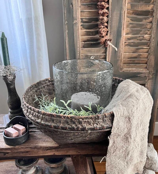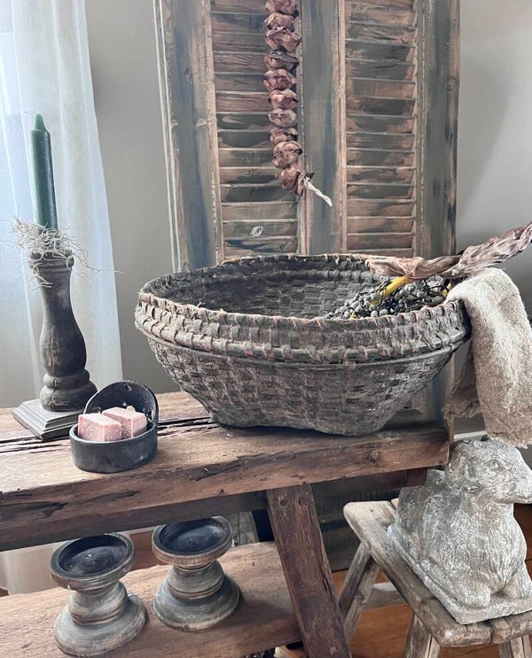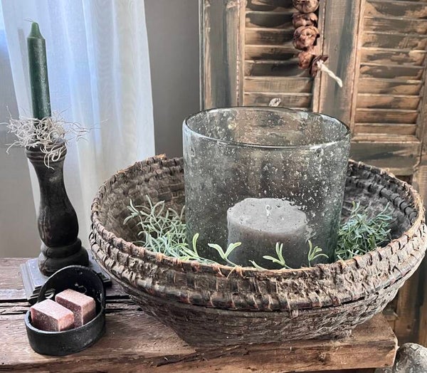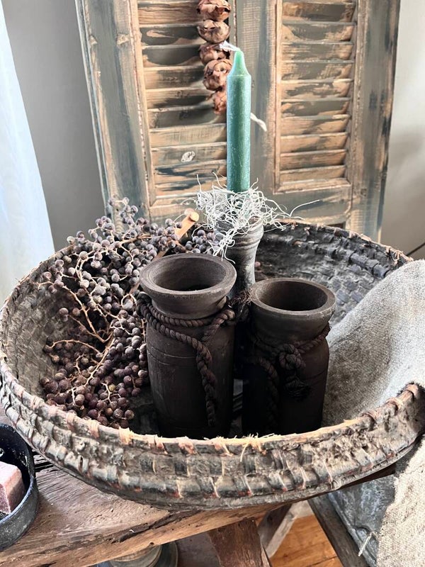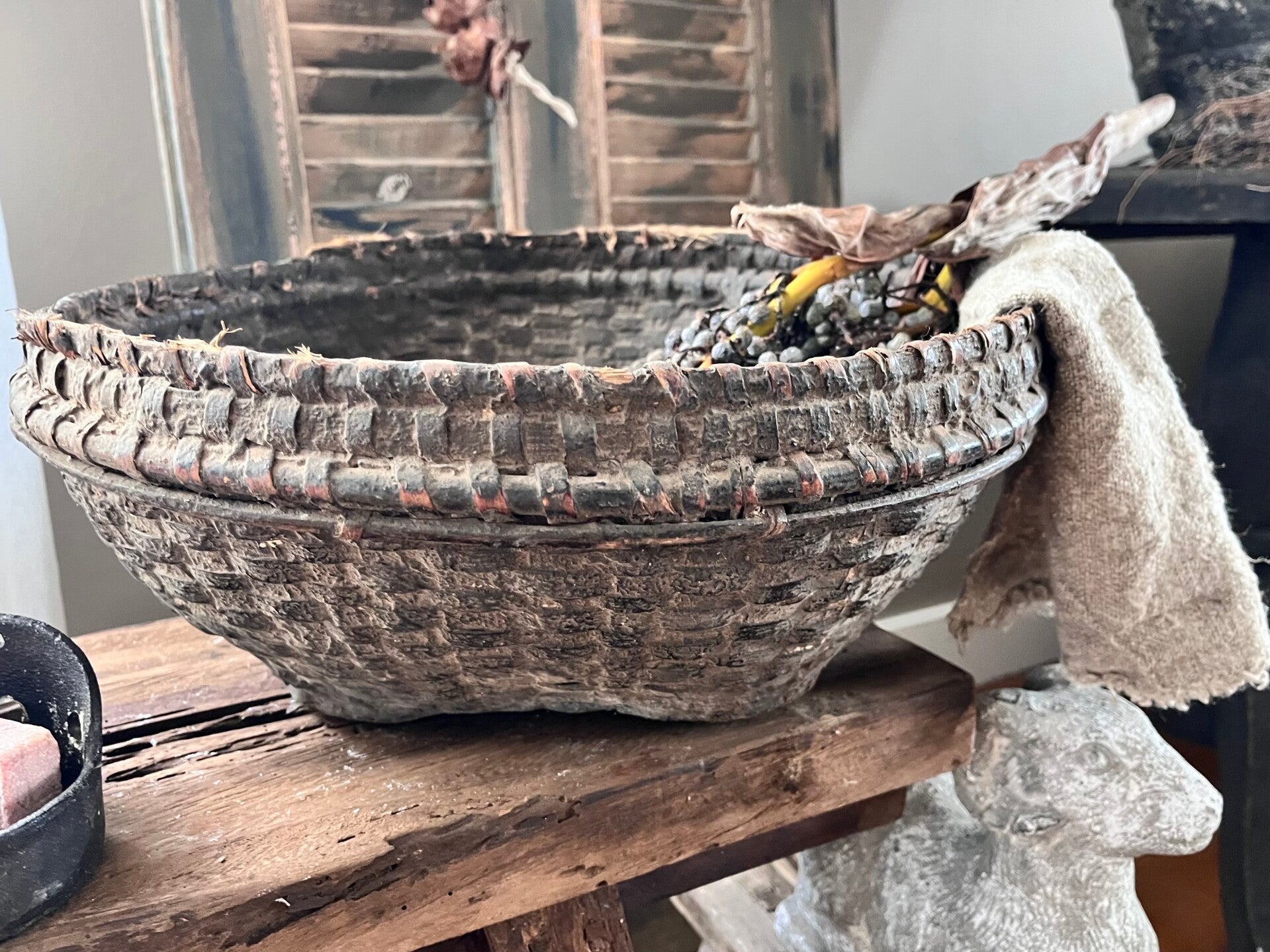 Het verouderde leem en riet inclusief de gebruikerssporen maken deze mand uniek.