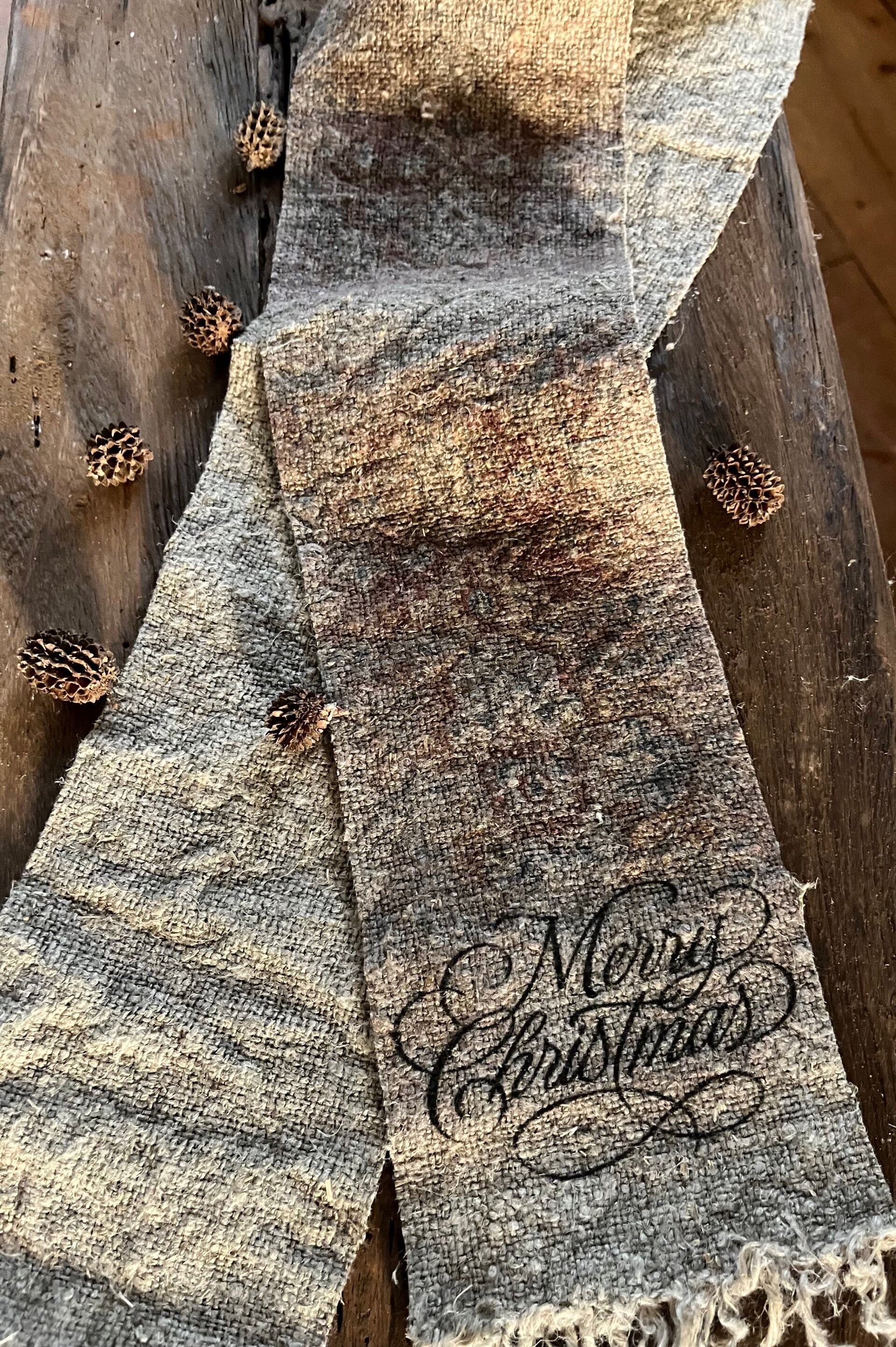 met in totaal ongeveer 25 cm rood bruingedrukte tekst Merry Christmas op donkere Kelim ondergrond.