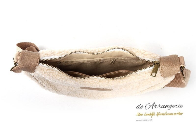De tas heeft van binnen één royaal vak en aan de achterkant nog een extra klein vakje met rits.