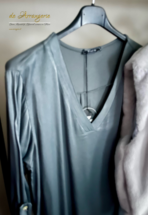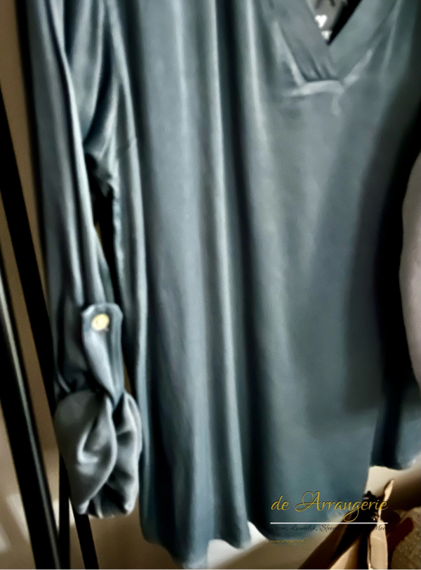 Satijnen top in petrol grey met V-hals en op haalbare mouwen.