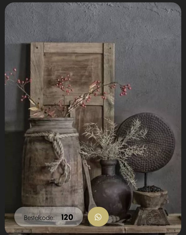 Stoer landelijk wanddoek in sobere kleuren.Afgewerkt met ruig zwart hout en met robuust touw om het aan op te hangen.