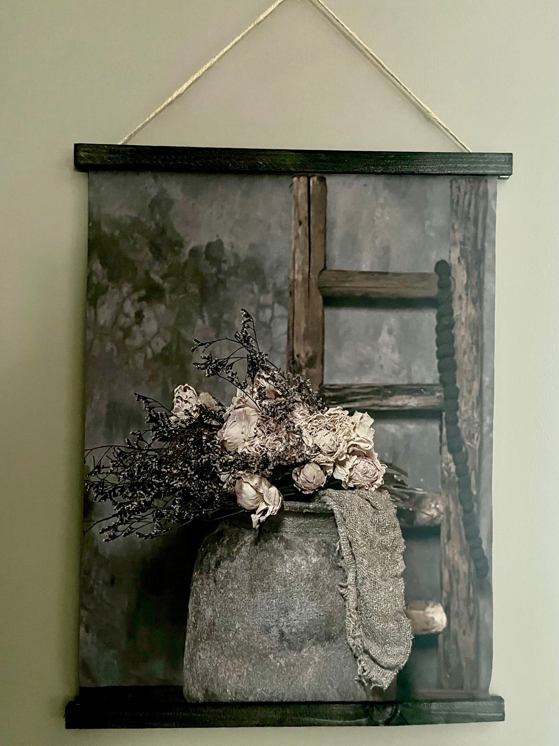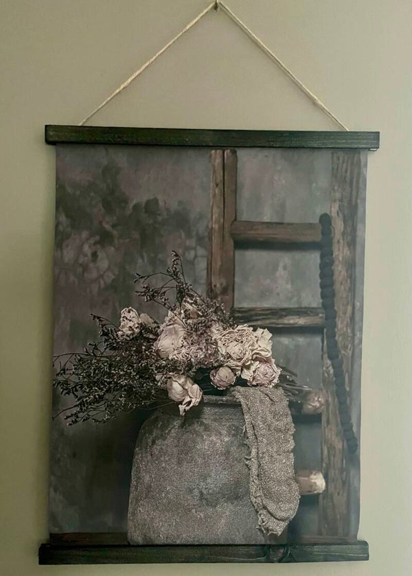 Stoer landelijk wanddoek in sobere kleuren.Afgewerkt met ruig zwart hout en met robuust touw om het aan op te hangen.
