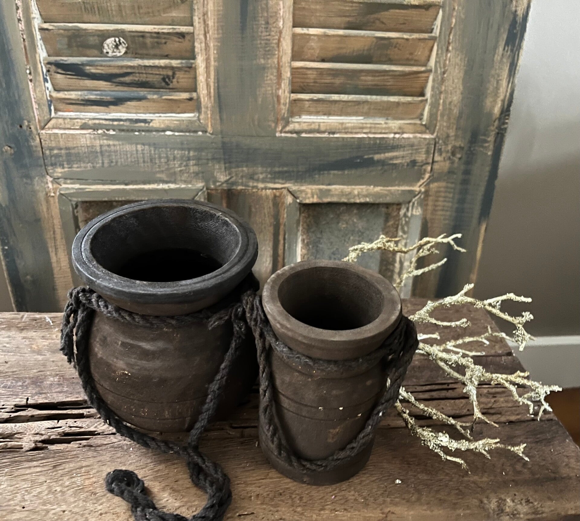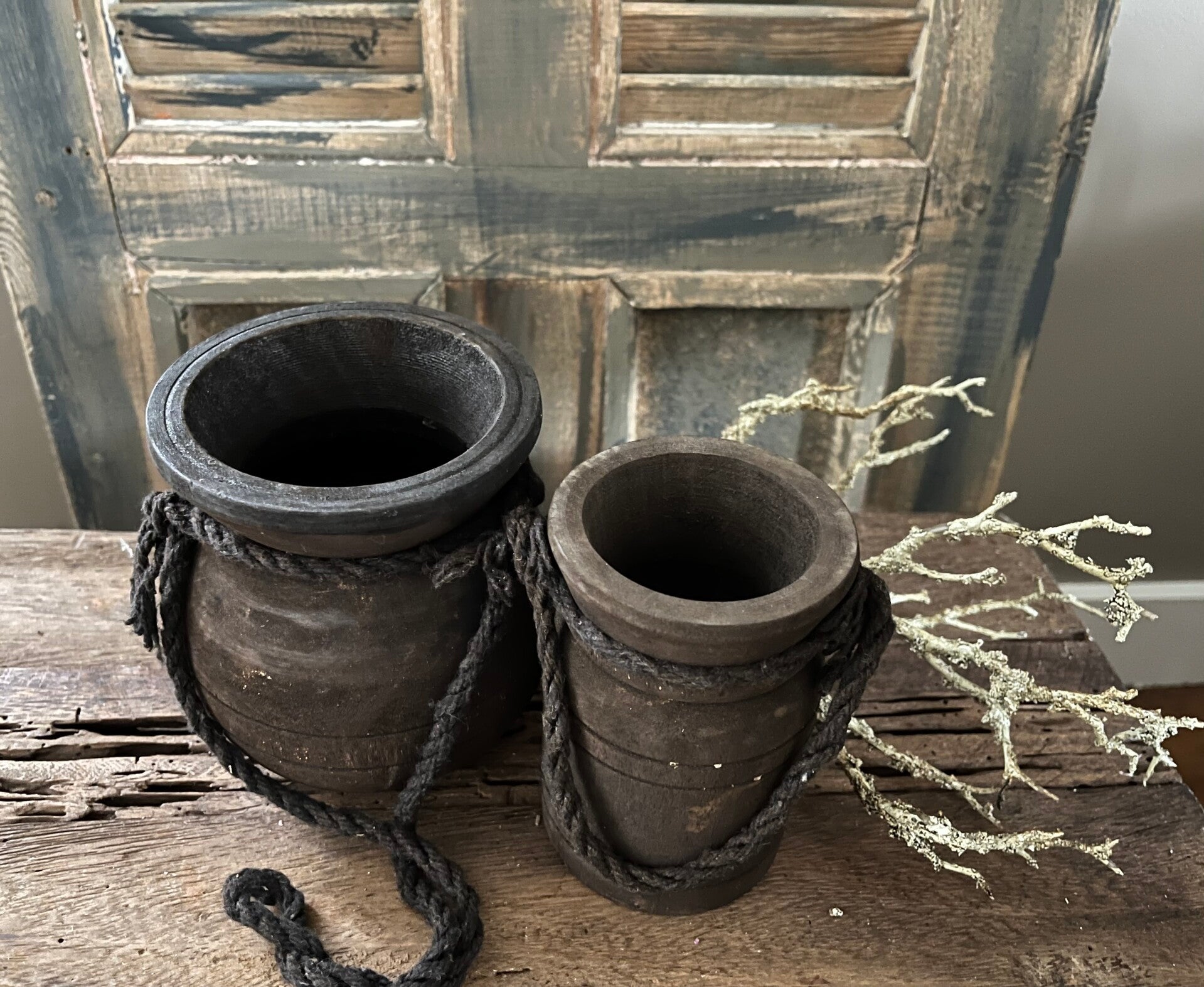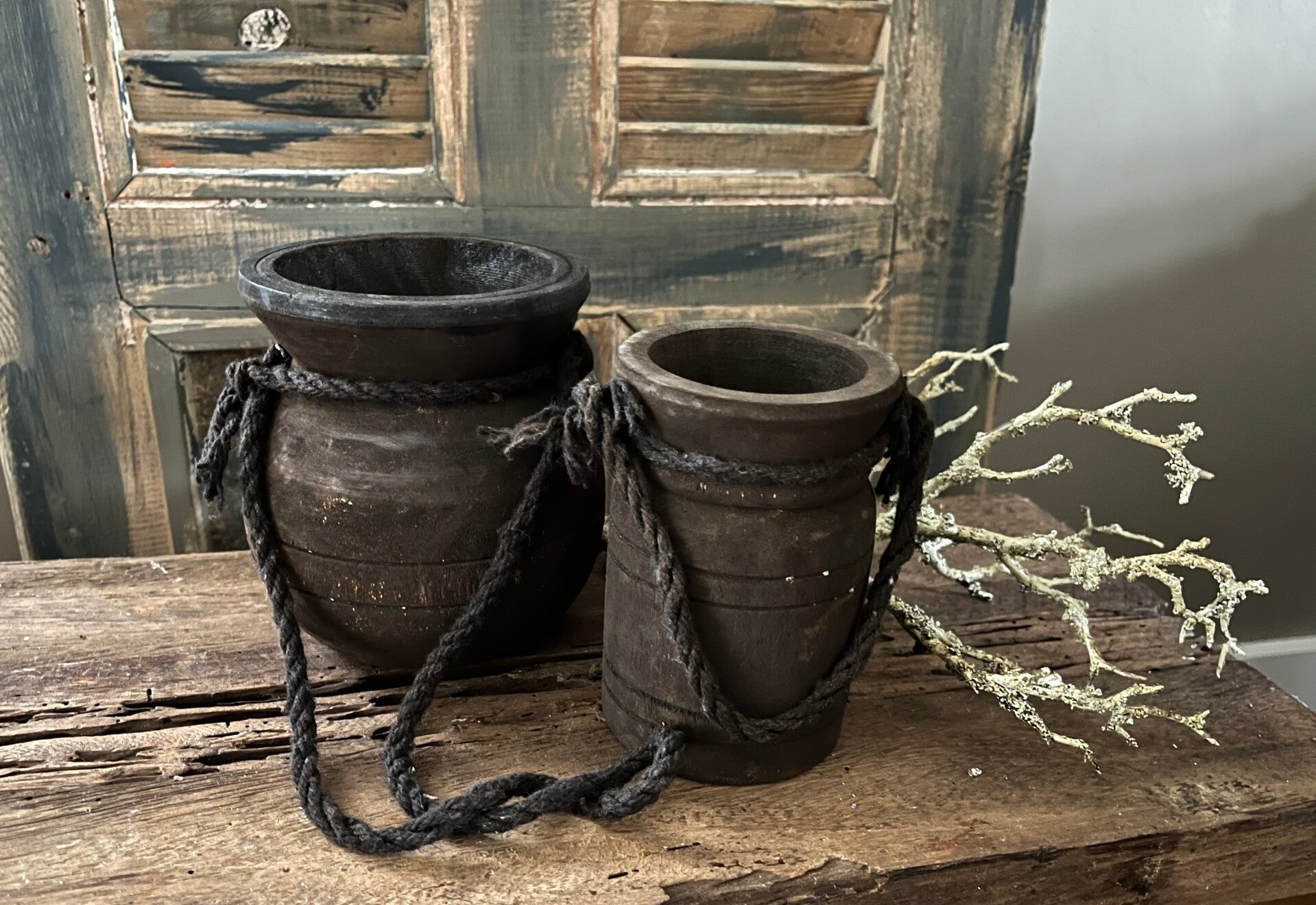 kleine houten Nepalese kruikjes Met robuust touw