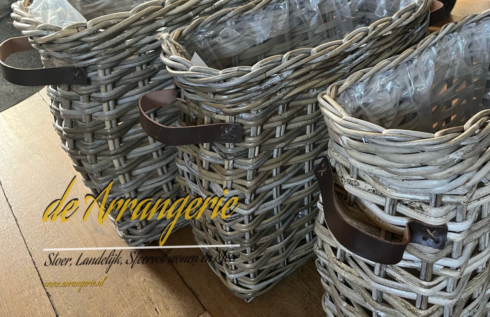 Stevige rieten vensterbank manden met leren handgrepen in 3 maten.