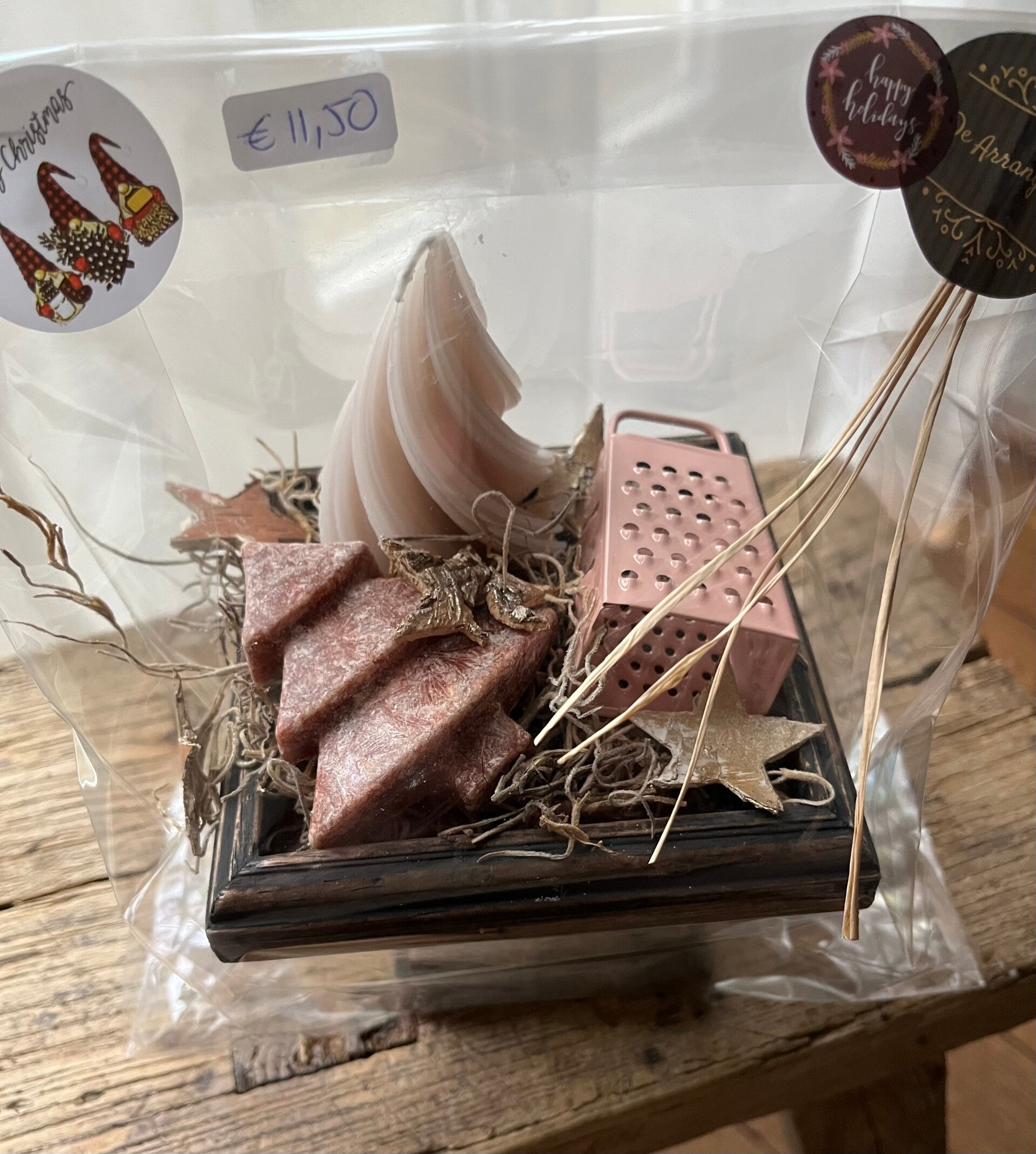 houtsn plateau op voet met daarop amber kerstboom, kerstboompkaarsje en raspje