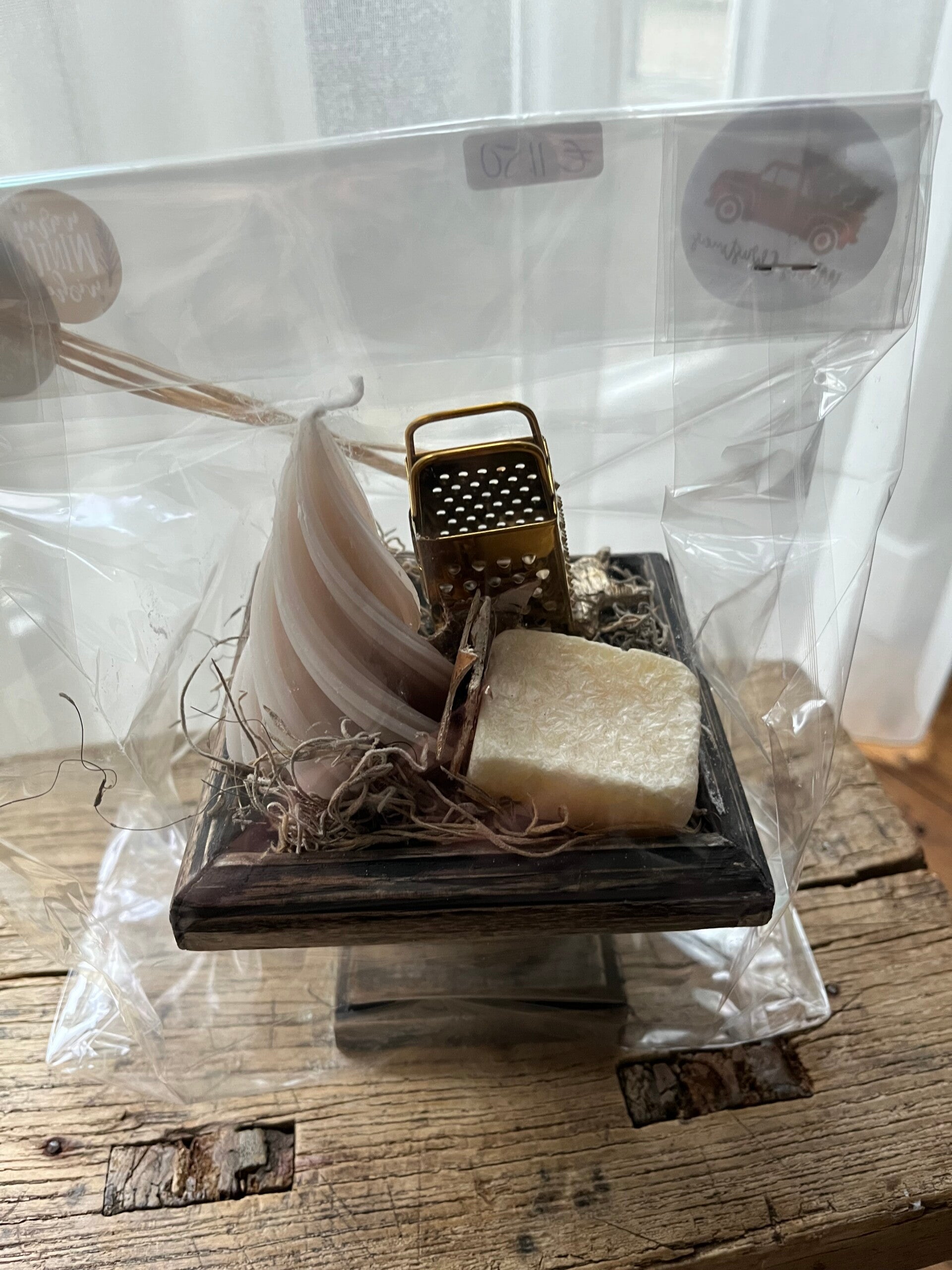 Houten plateau op voet met daarop kerstboompkaarsje, raspje en jerstboomkaarsje