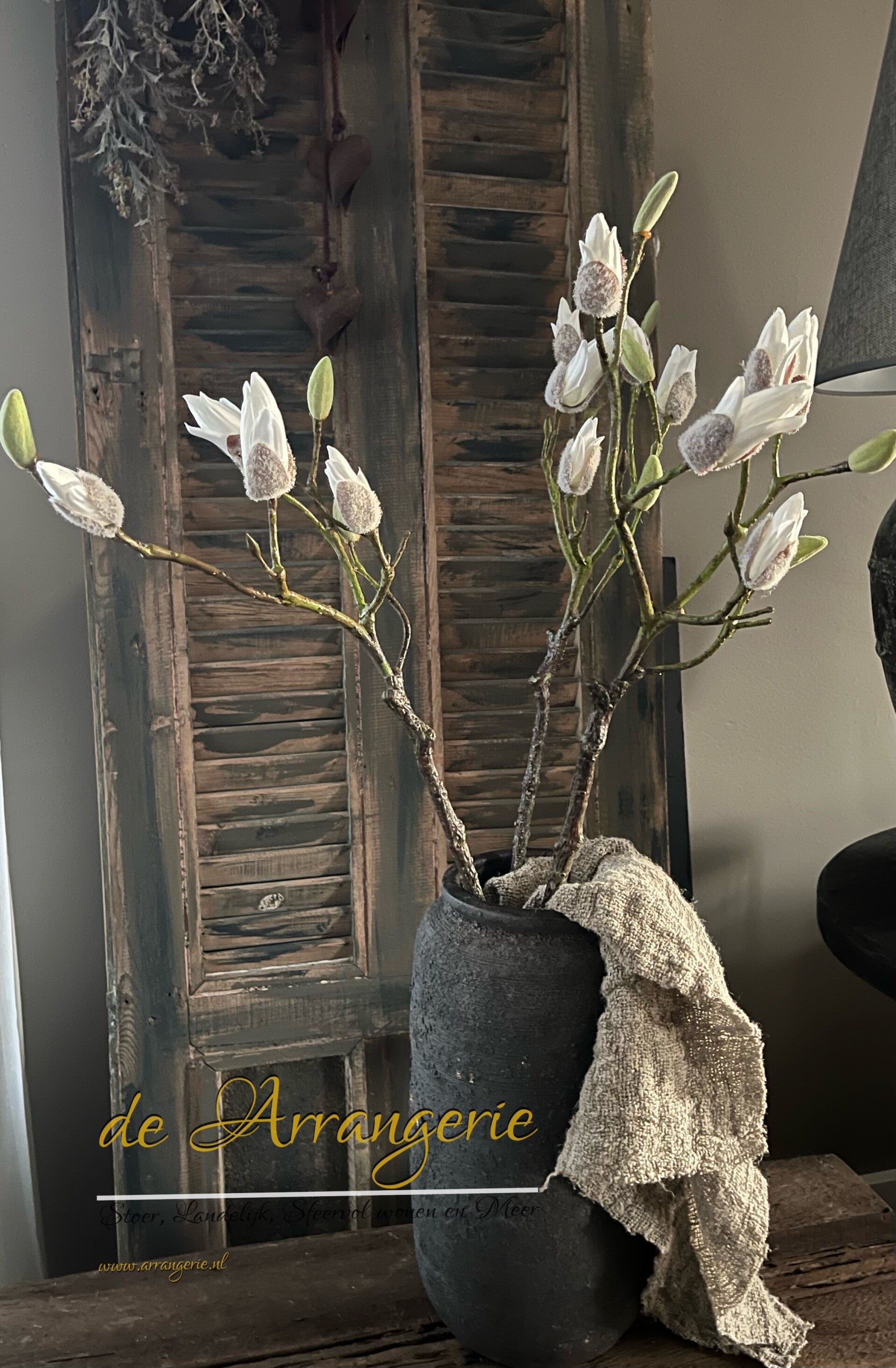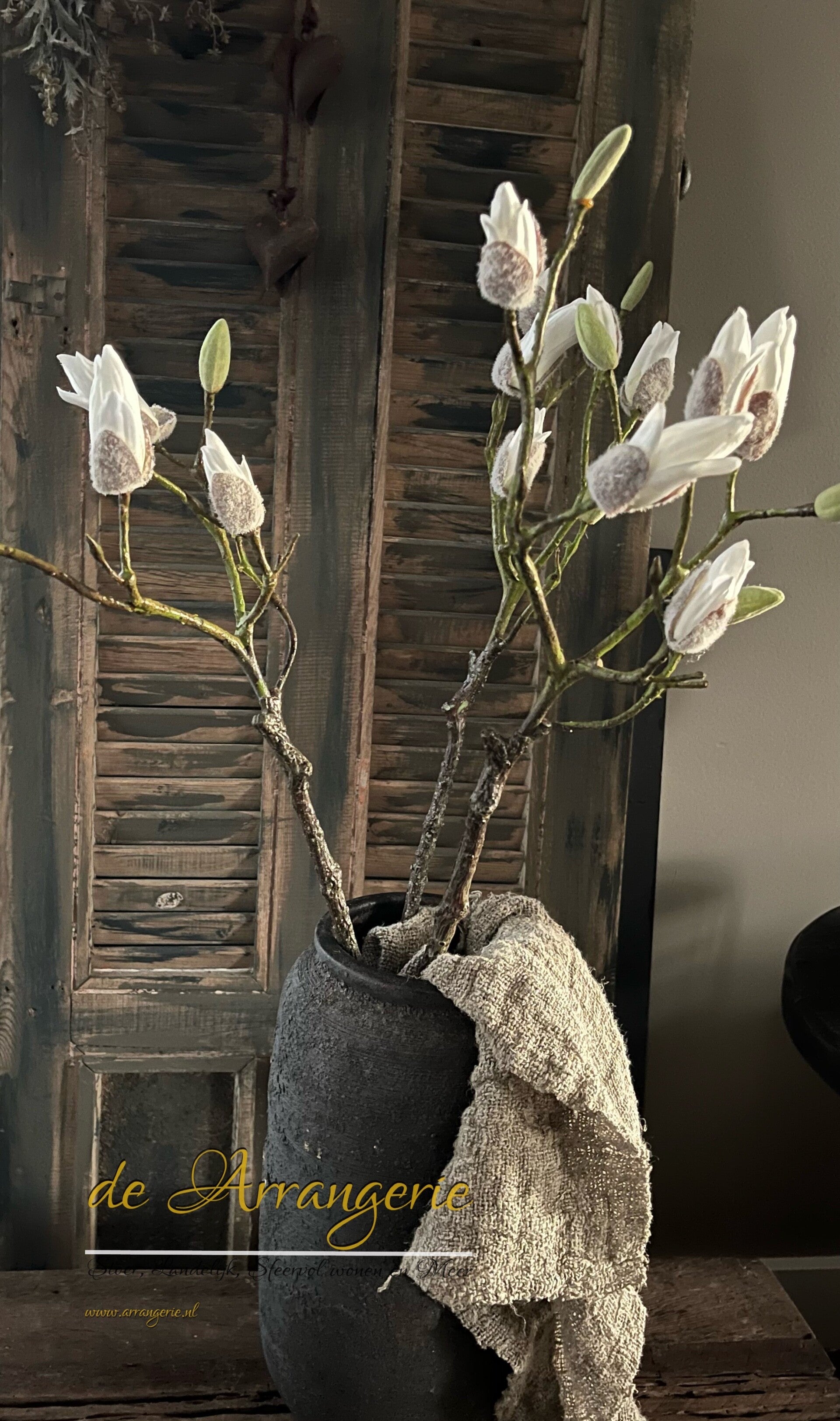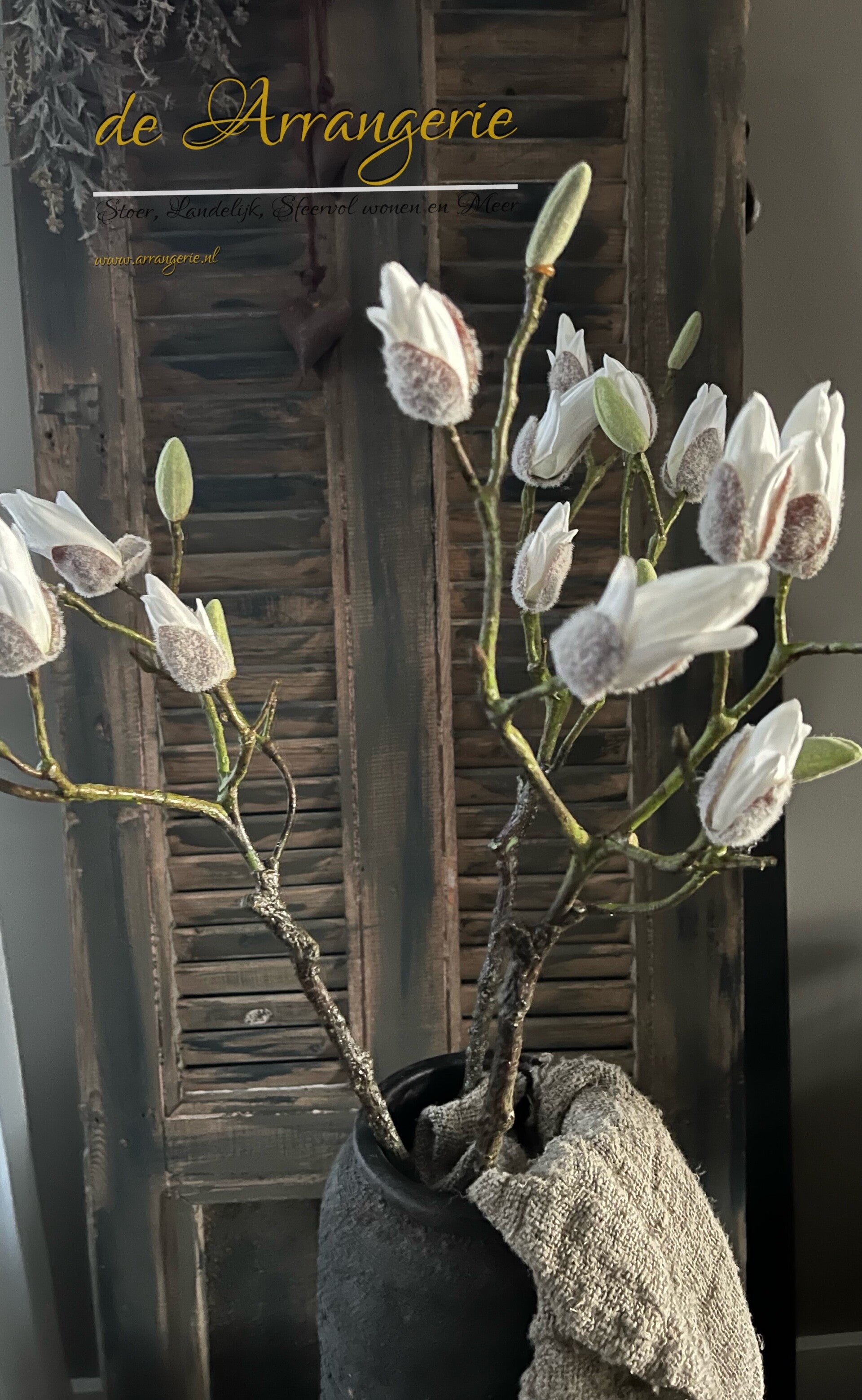 Combineer deze magnolia tak met andere zijden bloemen of gebruik hem solo voor een minimalistisch statement. Ideaal voor zowel moderne als klassieke interieurs.
