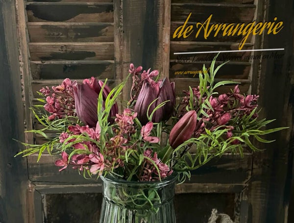 Mini tulpjes dark Purple in boeketje samen met dark Pink takjes