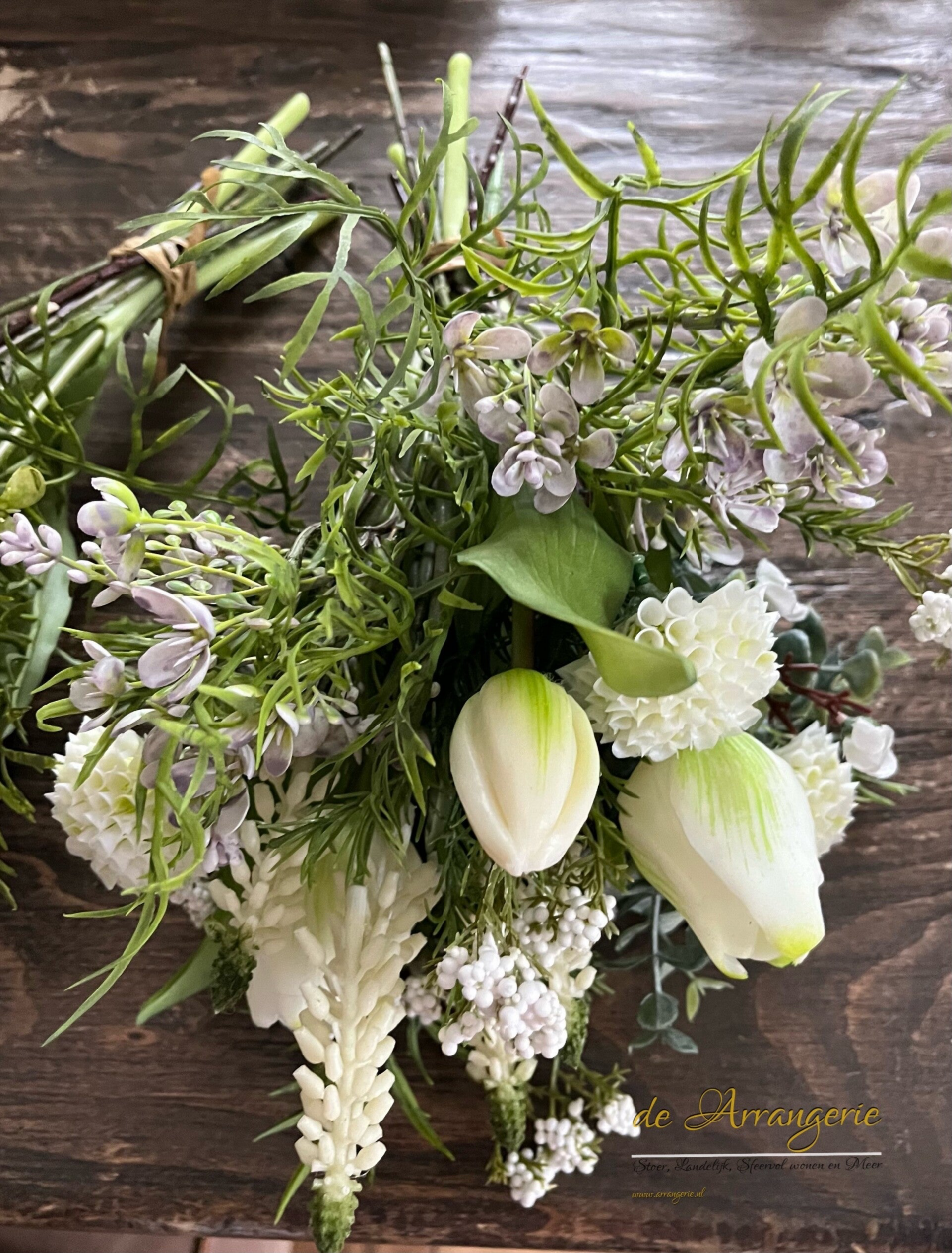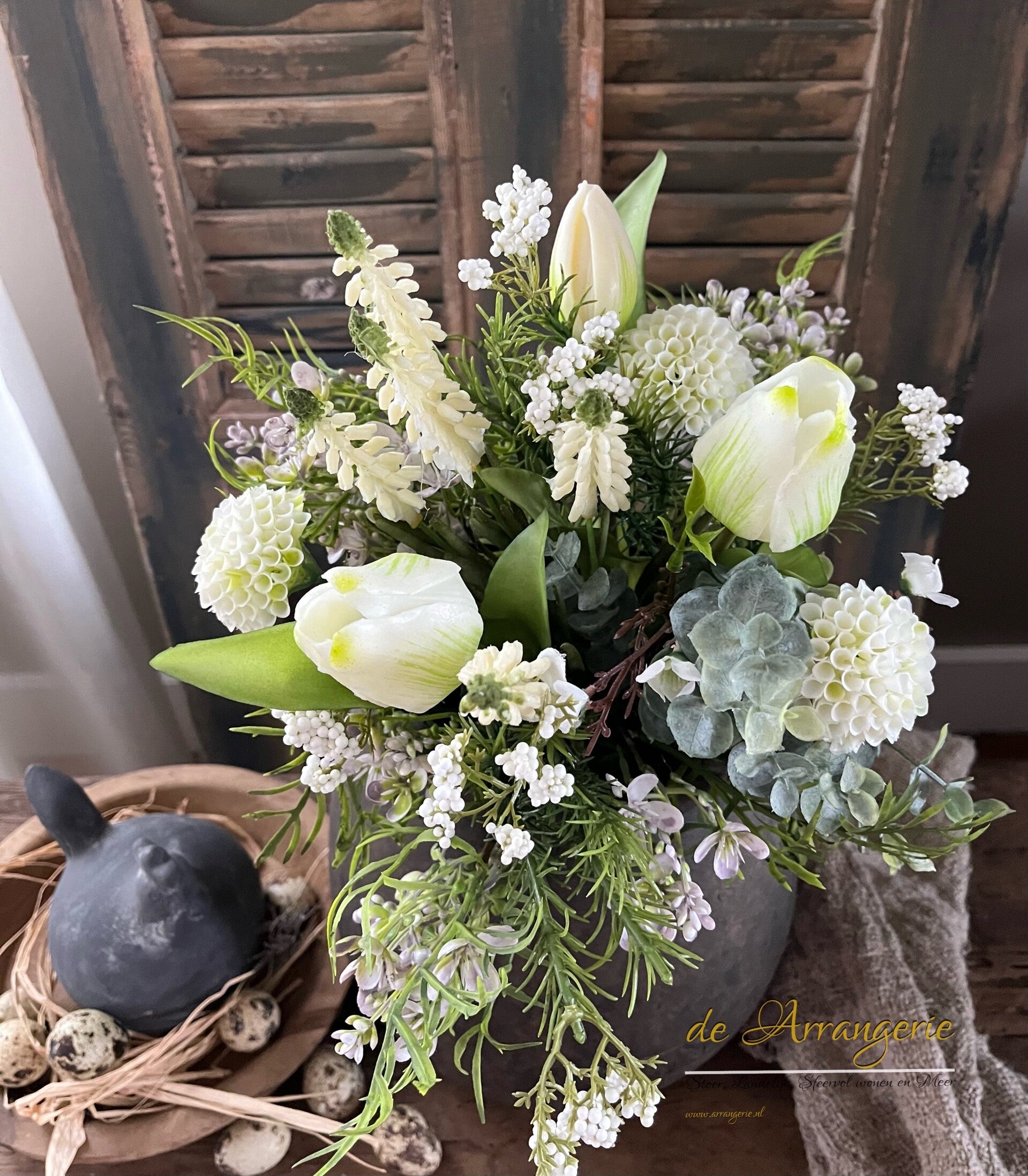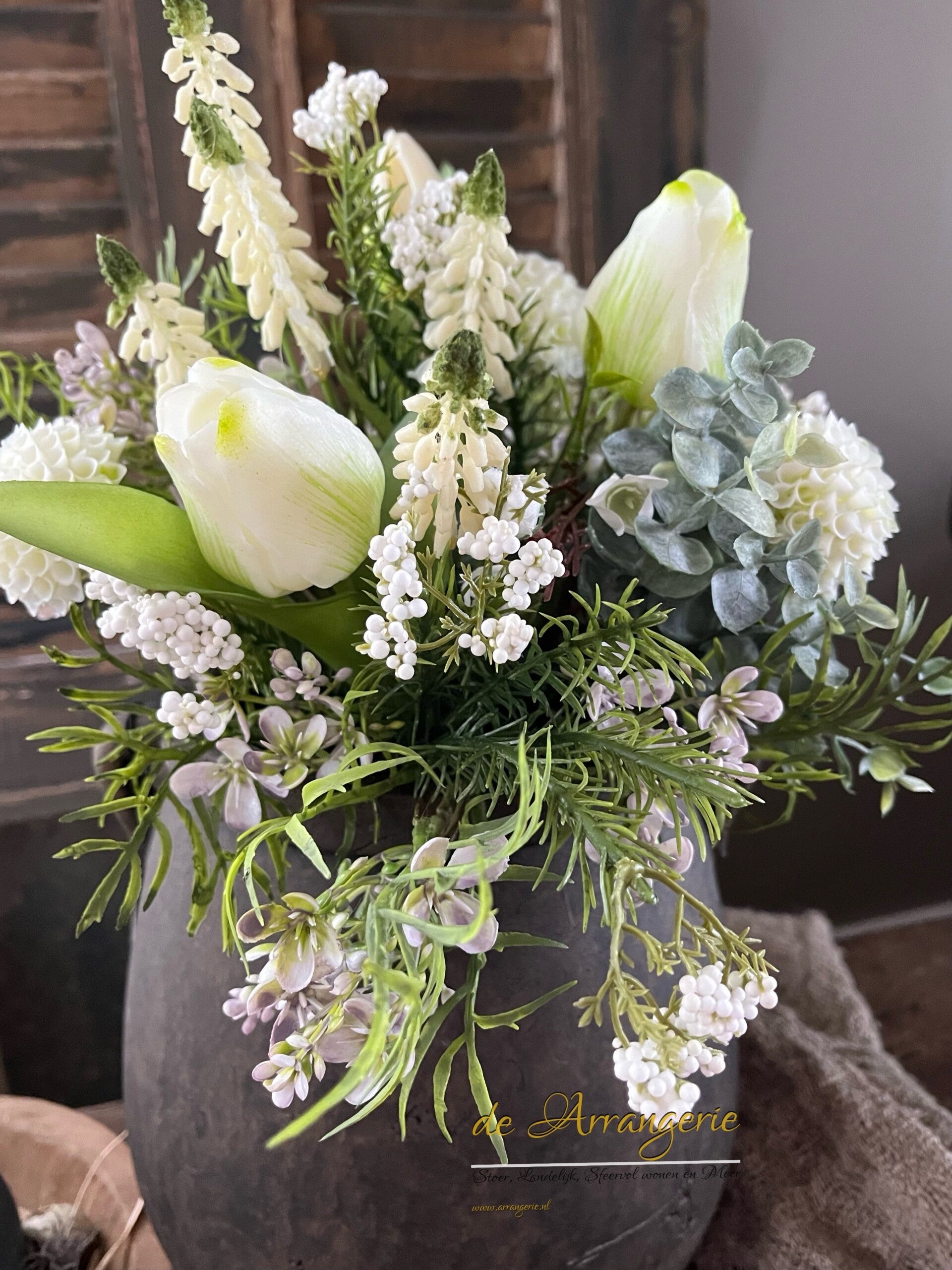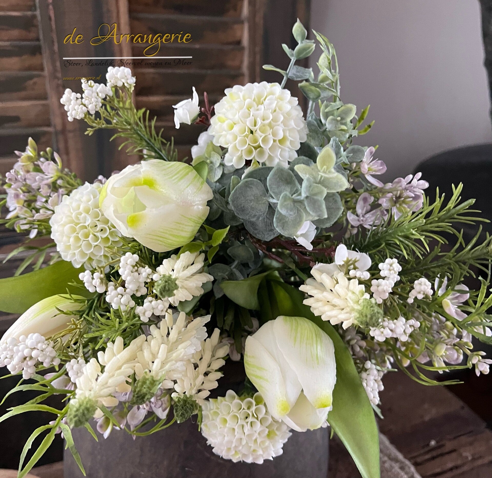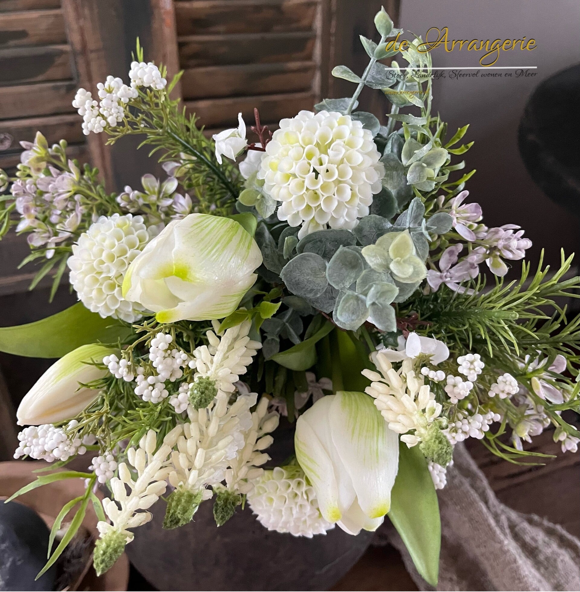 Prachtig kant en klaar boeket van real touch tulpen, witte druifjes, pompon dahlia's en andere leuke takjes in groen en wit