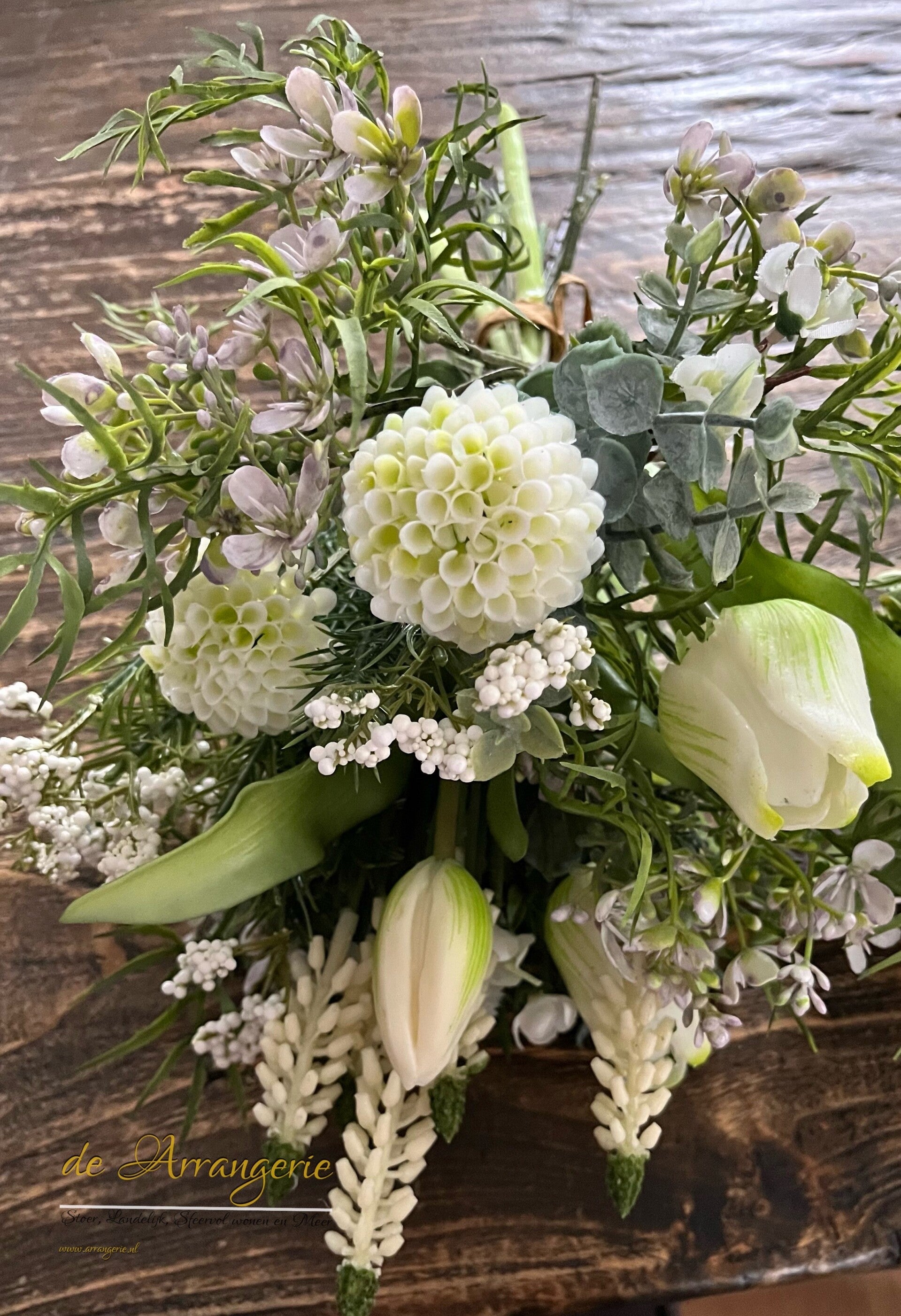 Prachtig kant en klaar boeket van real touch tulpen, witte druifjes, pompon dahlia's en andere leuke takjes in groen en wit