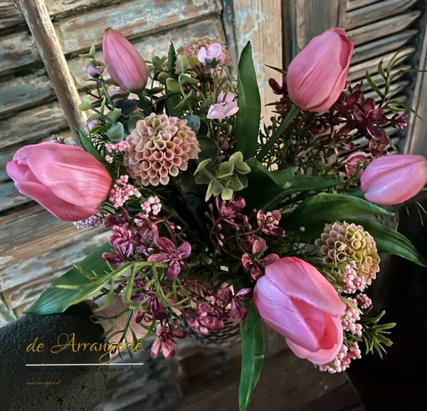 Prachtig kant en klaar boeket van 5 real touch tulpen, 3 pompon dahlia's en andere leuke takjes in pink met dark pink