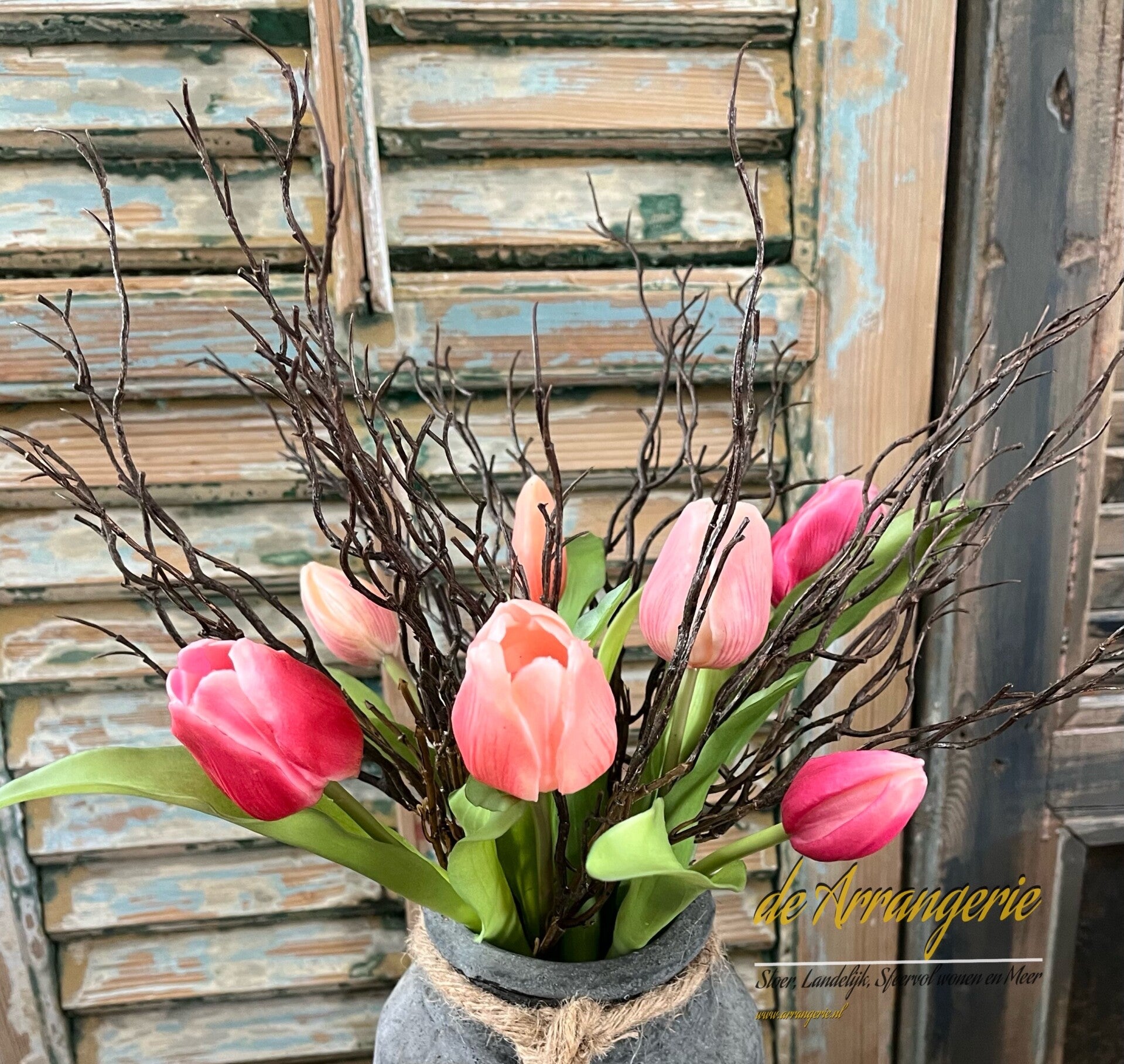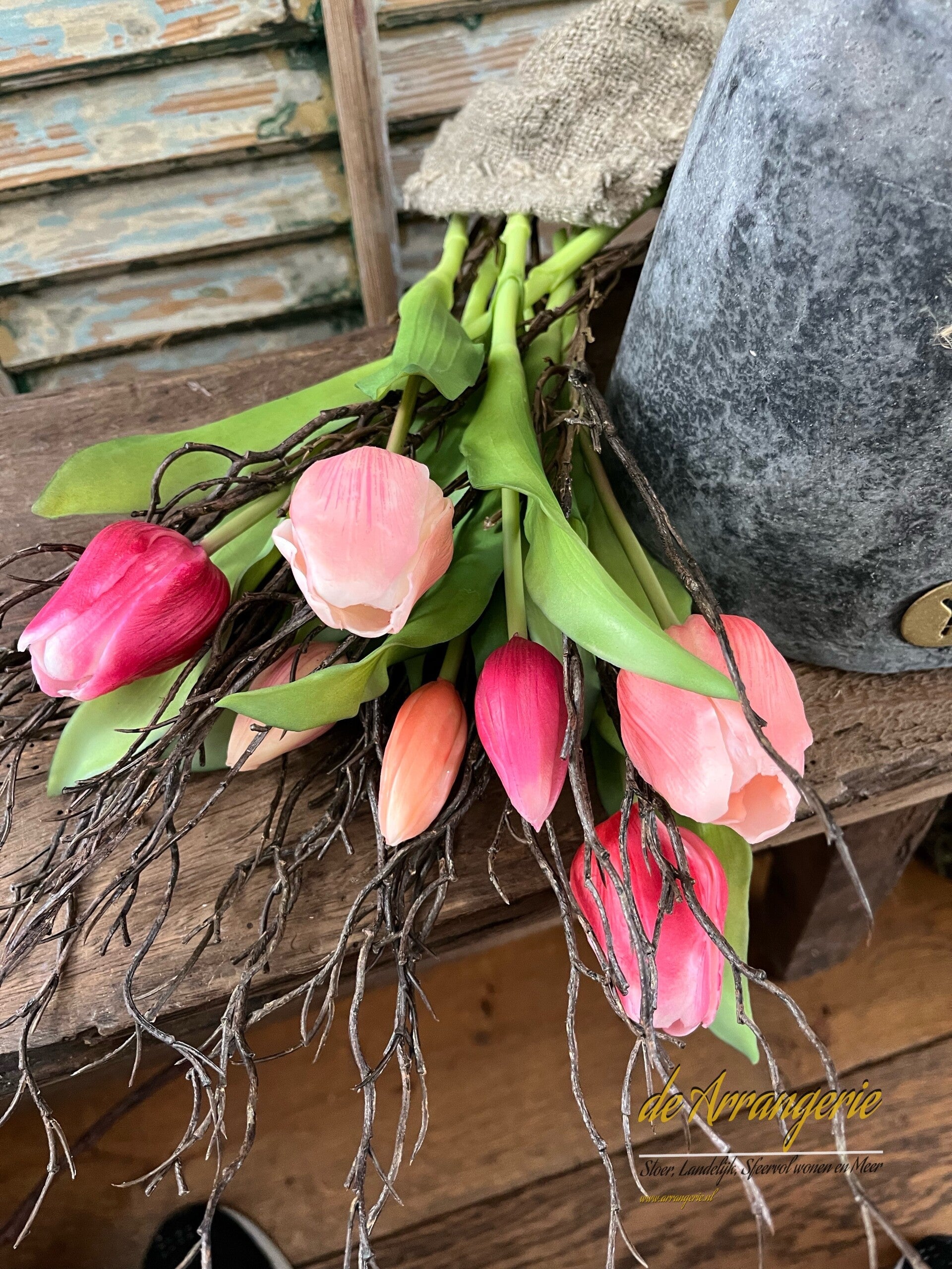 Prachtig tulpen boeket van 7 real touch tulpen, in een mix van verschillende roze kleuren met 6 bosbessentakkjes
