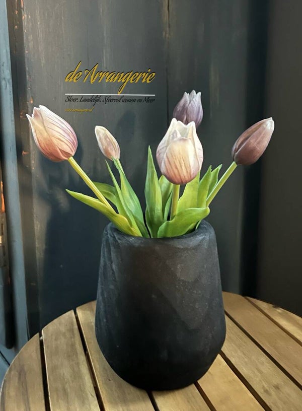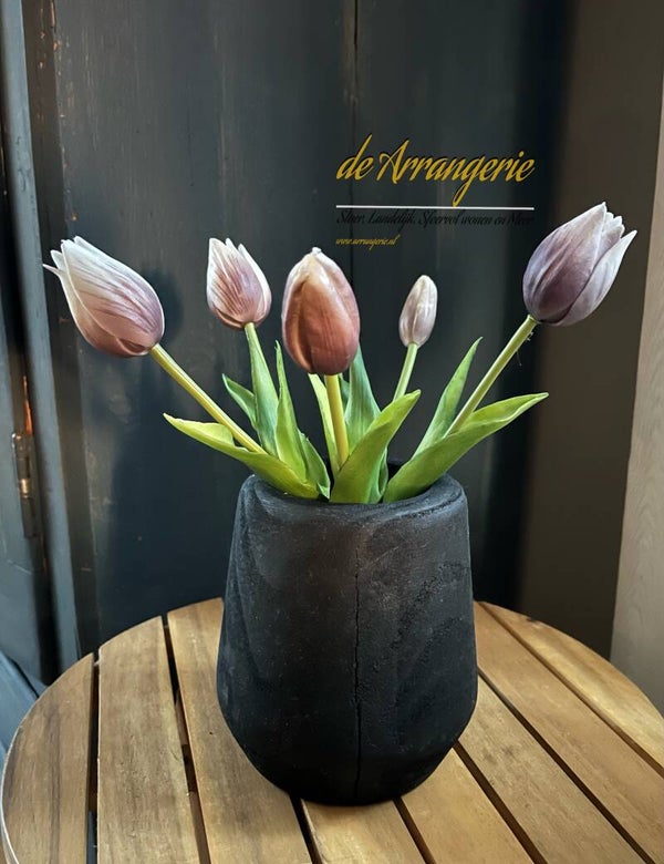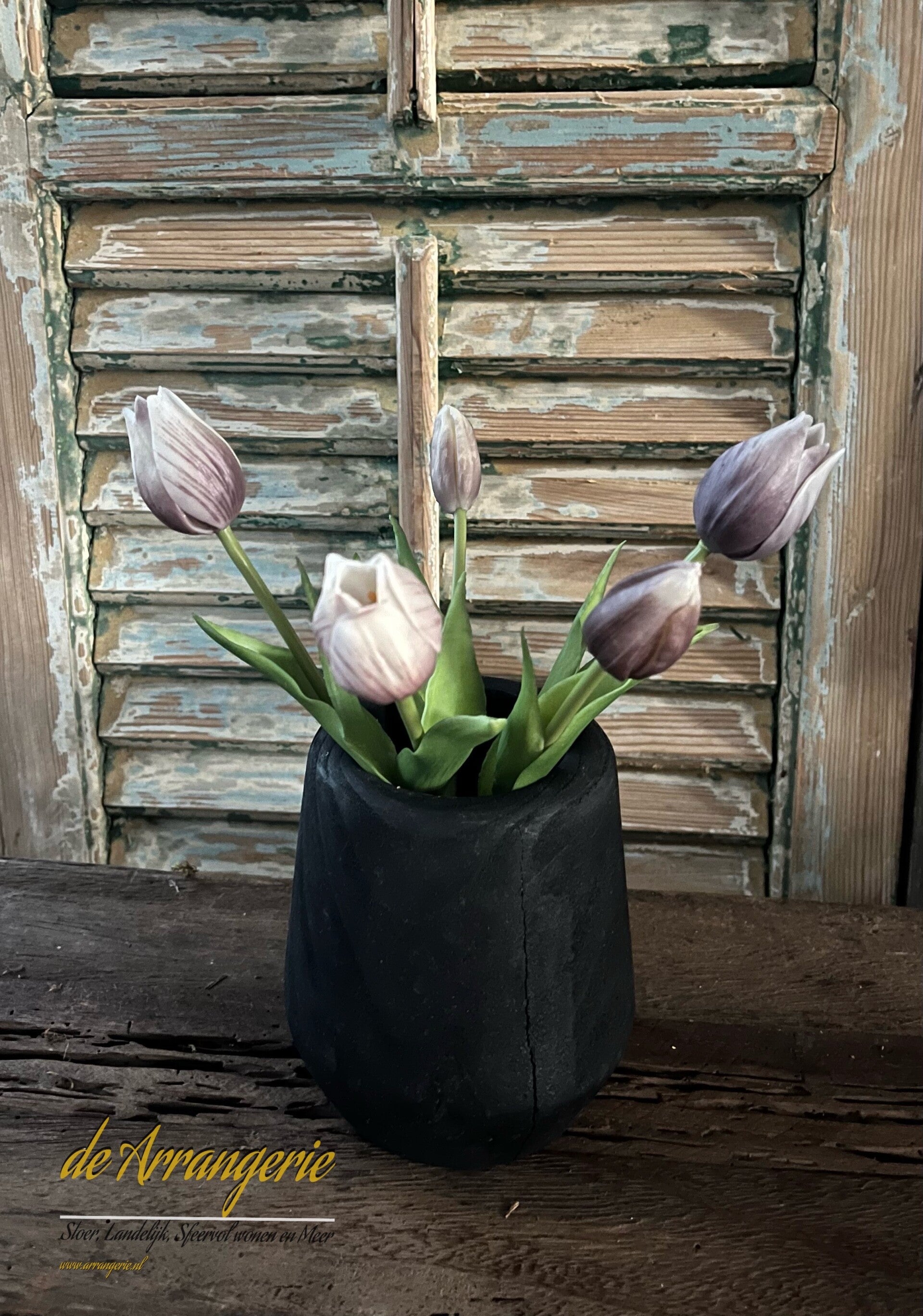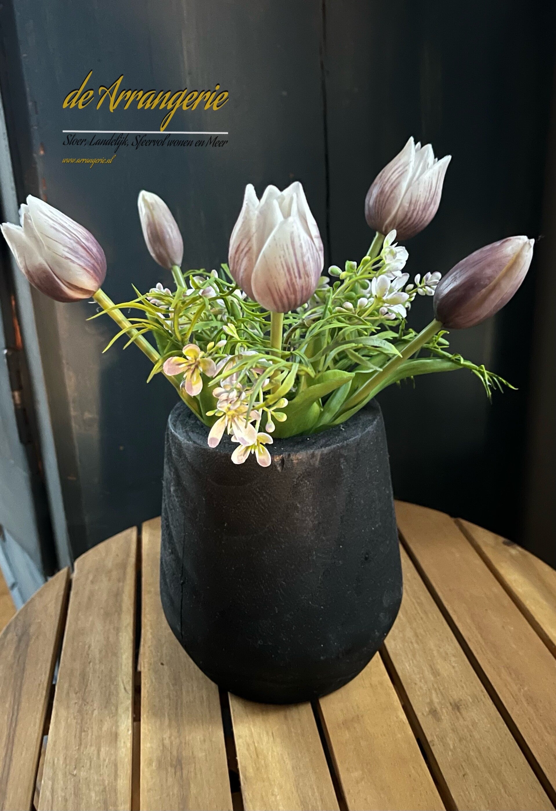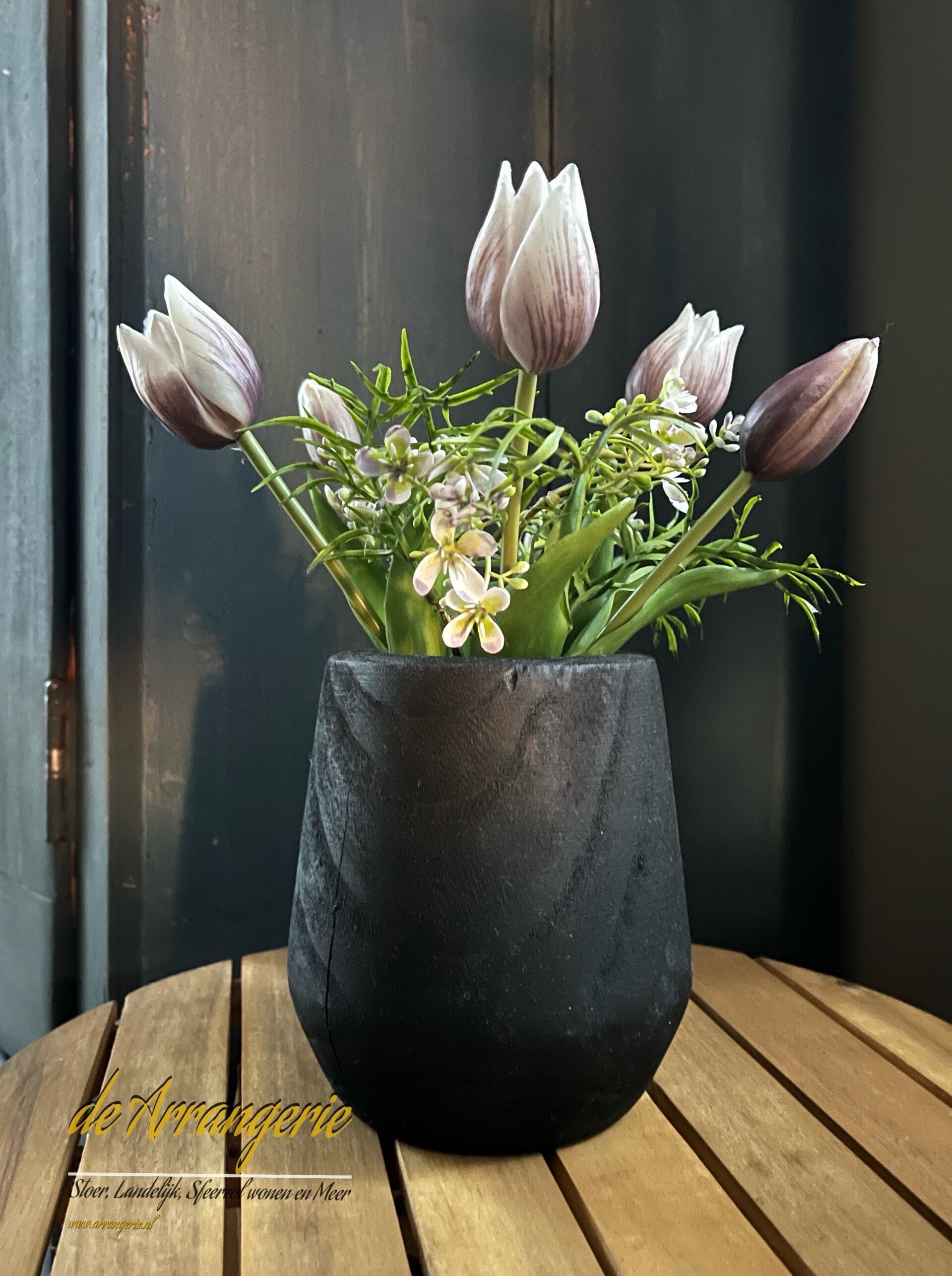 Zwart houten vaasje met bosje van 5 tulpen in purplegrey van 25cm en 2 takjes met bloemetjes in soft Purple grey