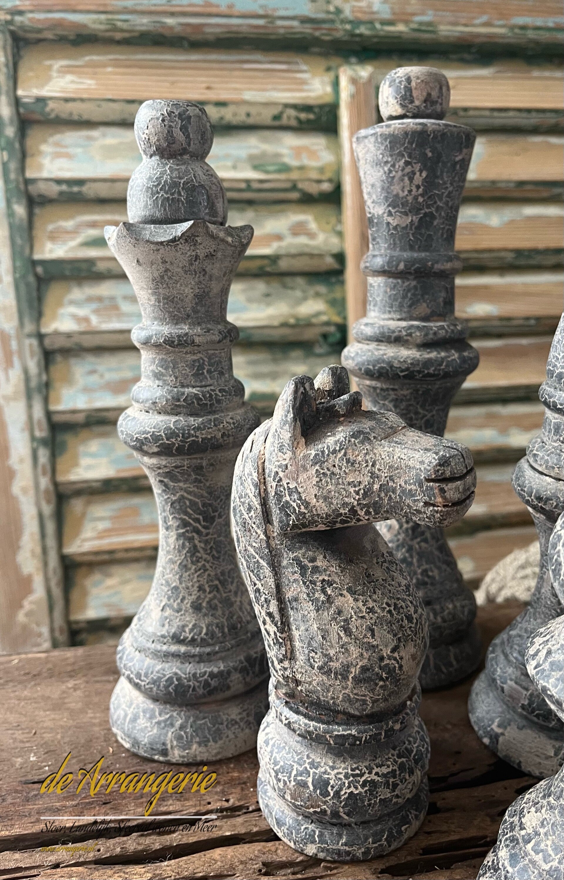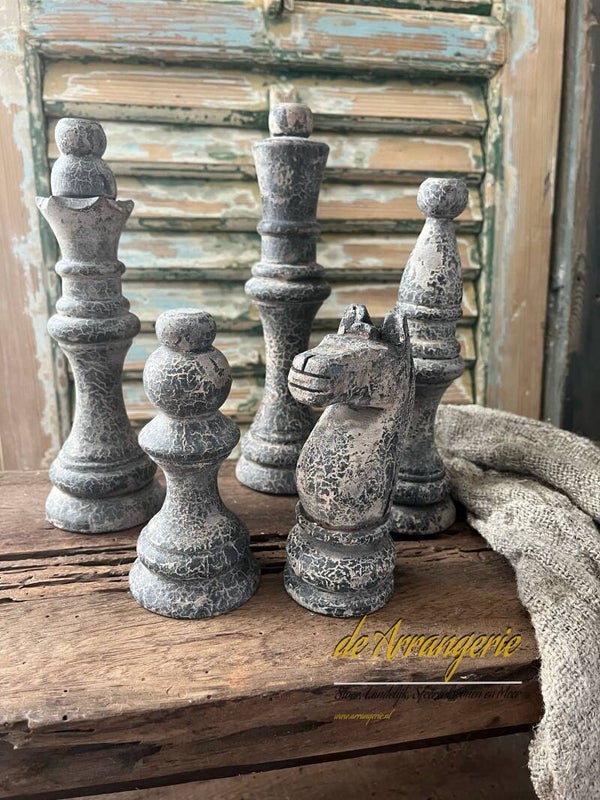 Deze landelijke set/5 decoratieve schaakstukken is volledig met de hand gemaakt en is afgewerkt met een geweldige craquelé patina.