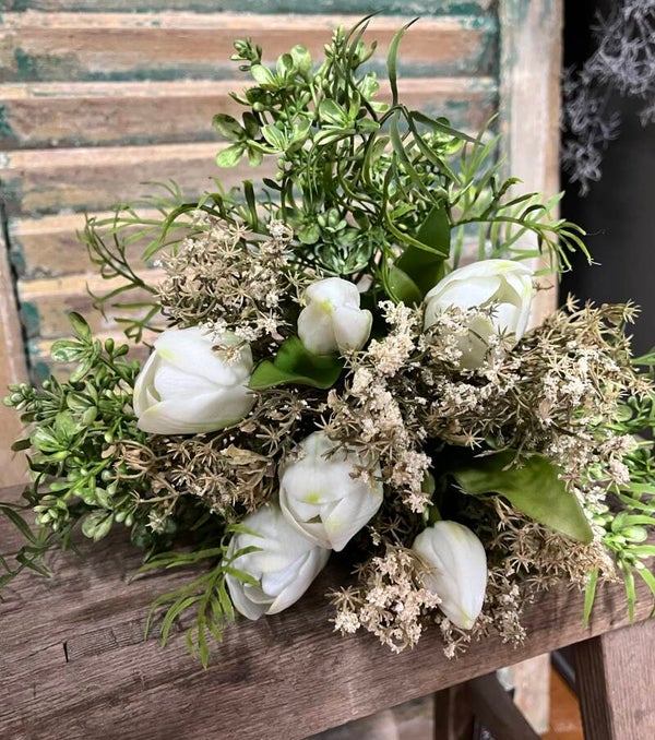 Boeketje witte tulpen 30cm met gipskruid en groene takjes