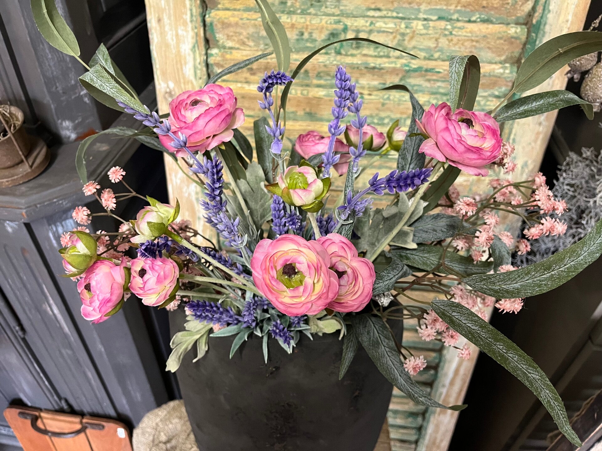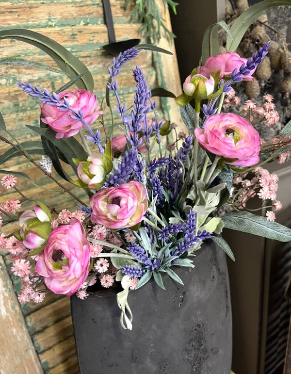 met roze ranonkels, lavendel, gipskruid en eucalyptus