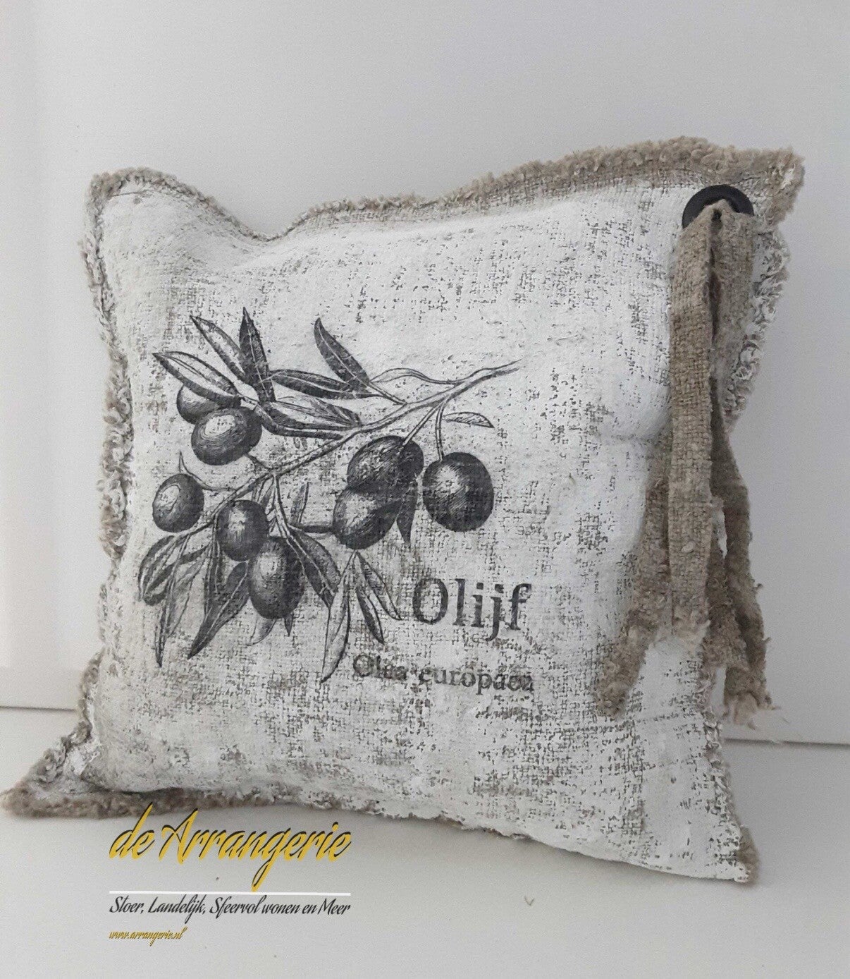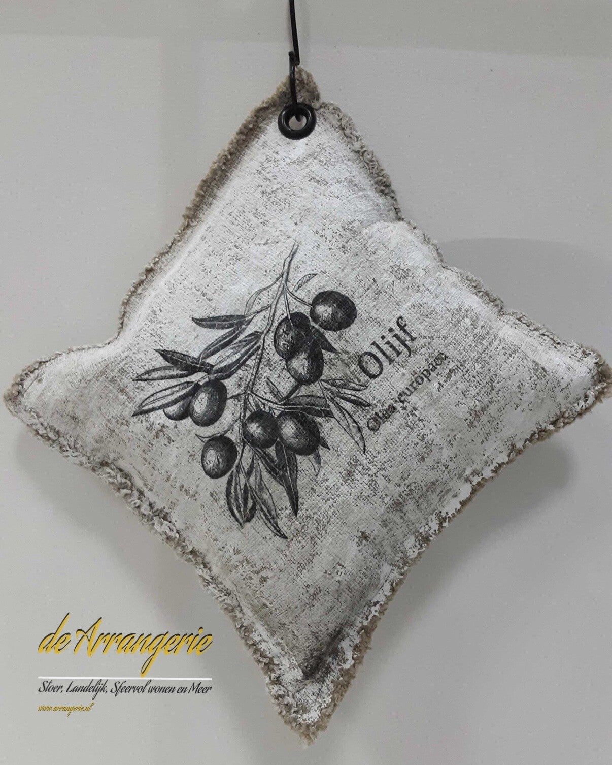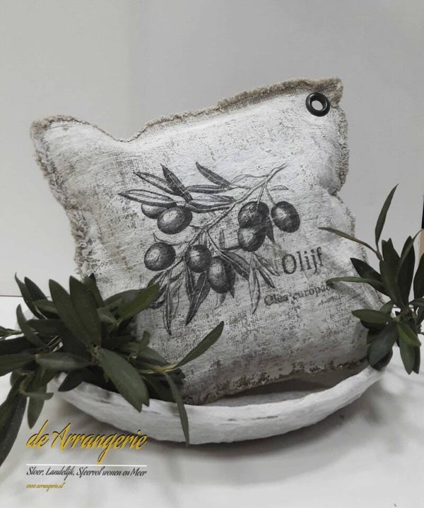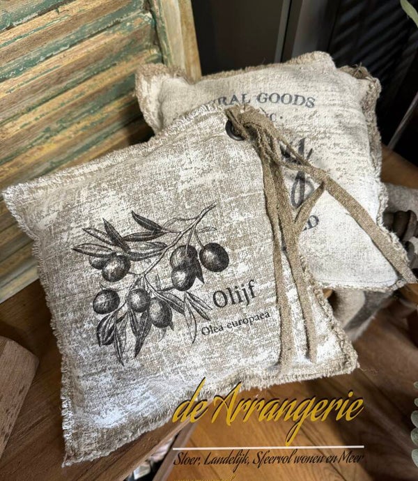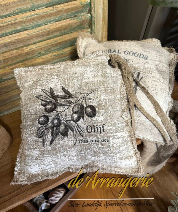 Shabby linnen kussentje van ongeveer 28×28 cm, aan één zijde offwhite gekalkt, en bedrukt, voorzien van zeiloog zodat je dit kussentje op kunt hangen.