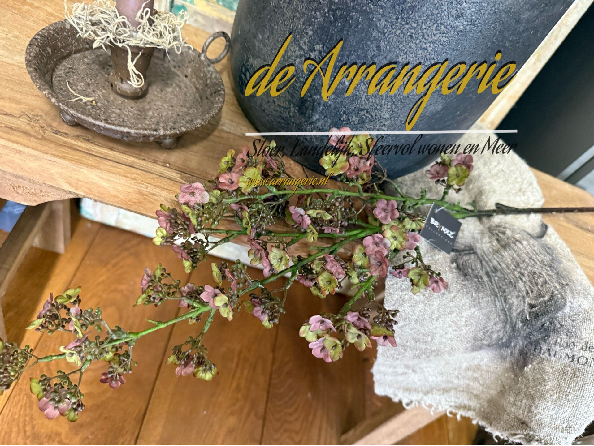 Deze zijden kunst bloementak van de Potentilla ofwel de Ganzerik zit vol met bloemetjes en bloemknopjes in groen en oudroze.