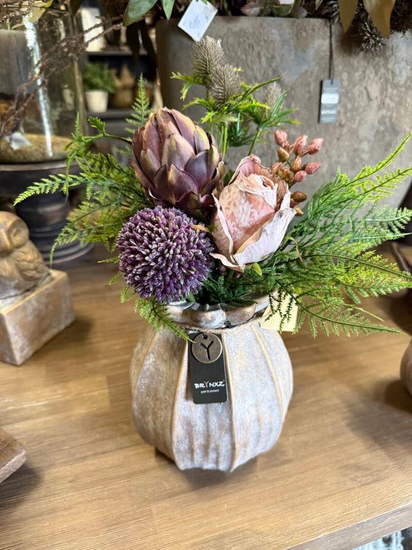 Boeketje met artisjok, alliumbol, roos, distels en andere takjes