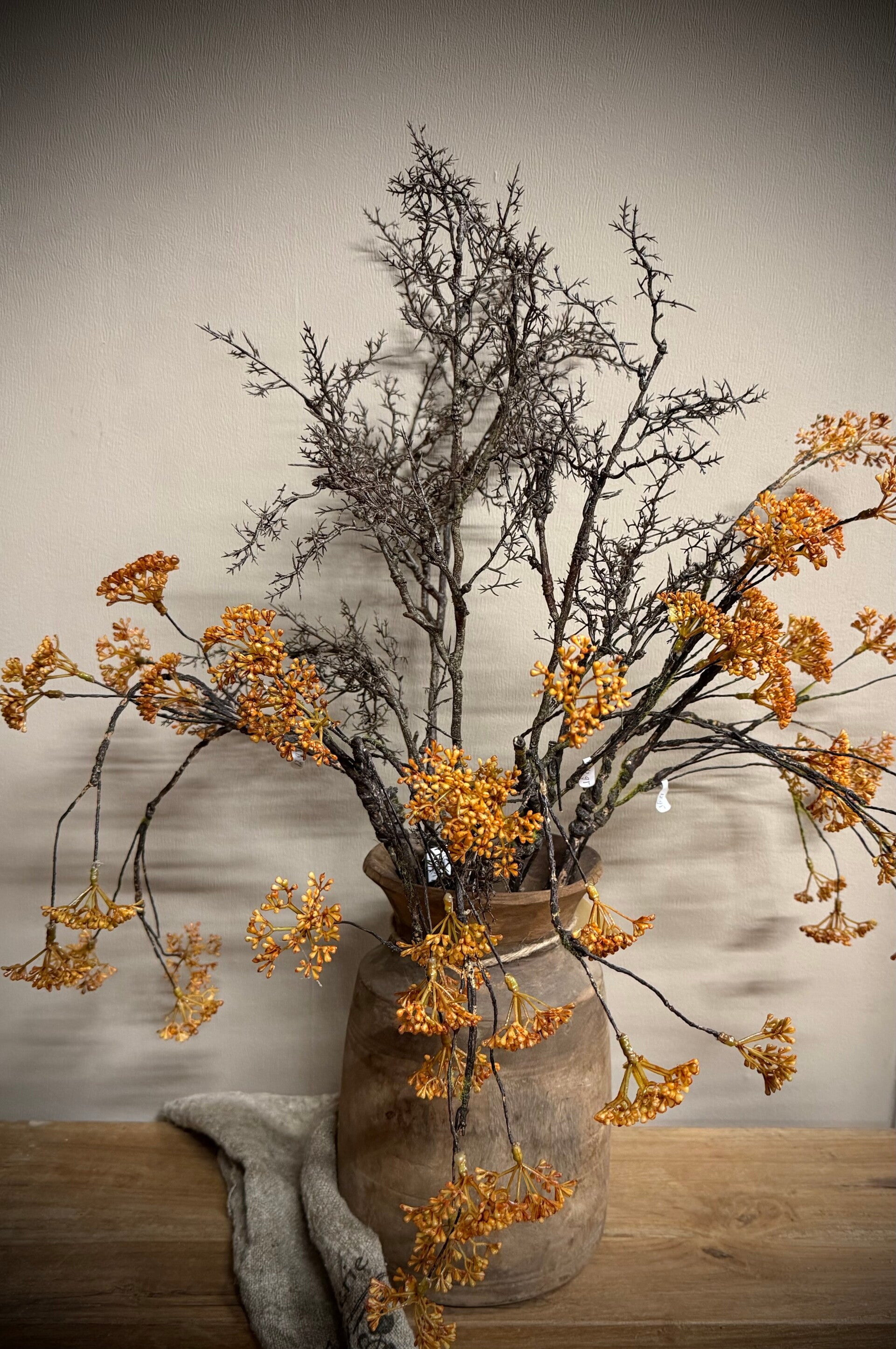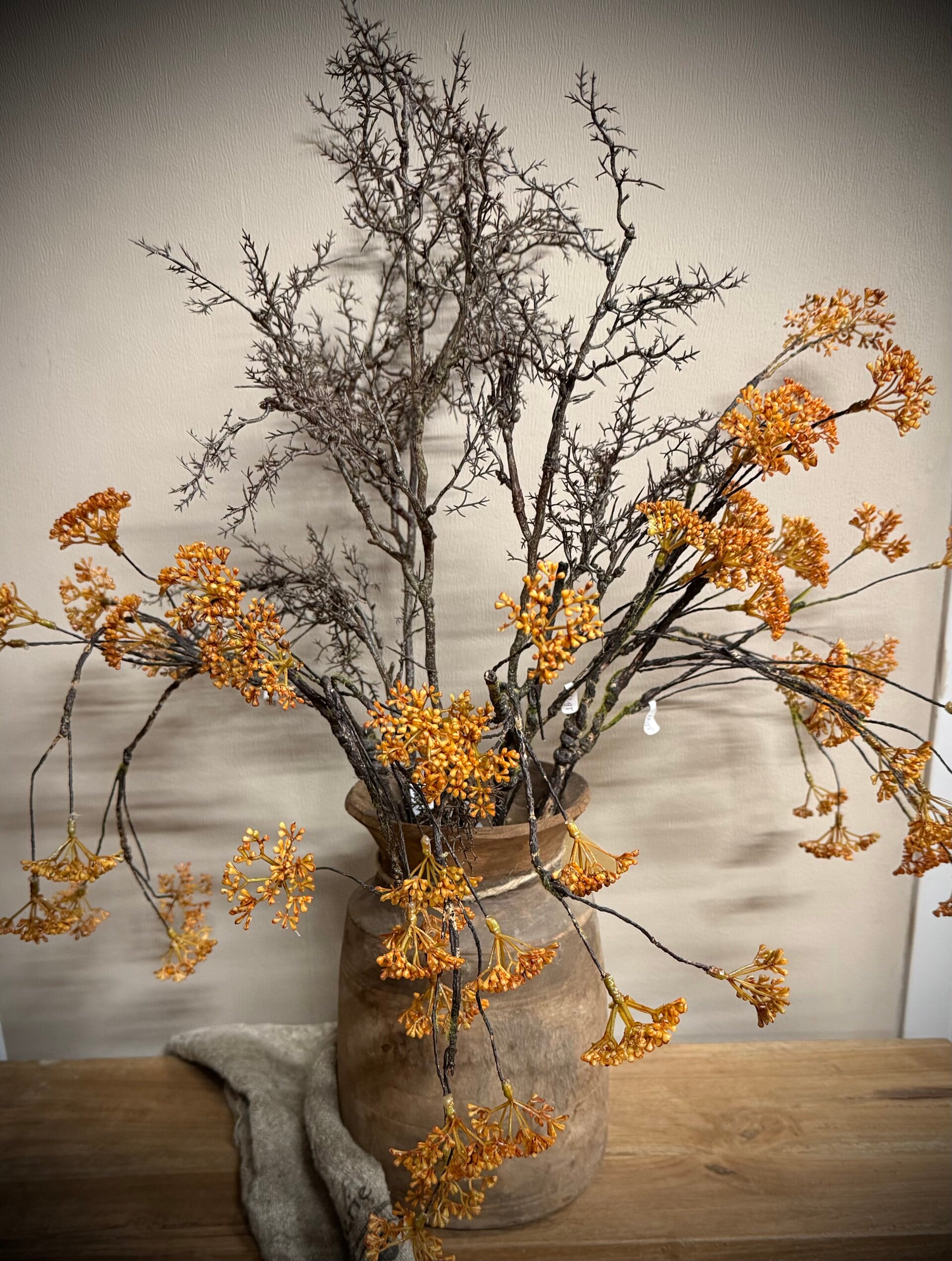 Oranje kunsttak met mos (viburnum) en wilde tak
