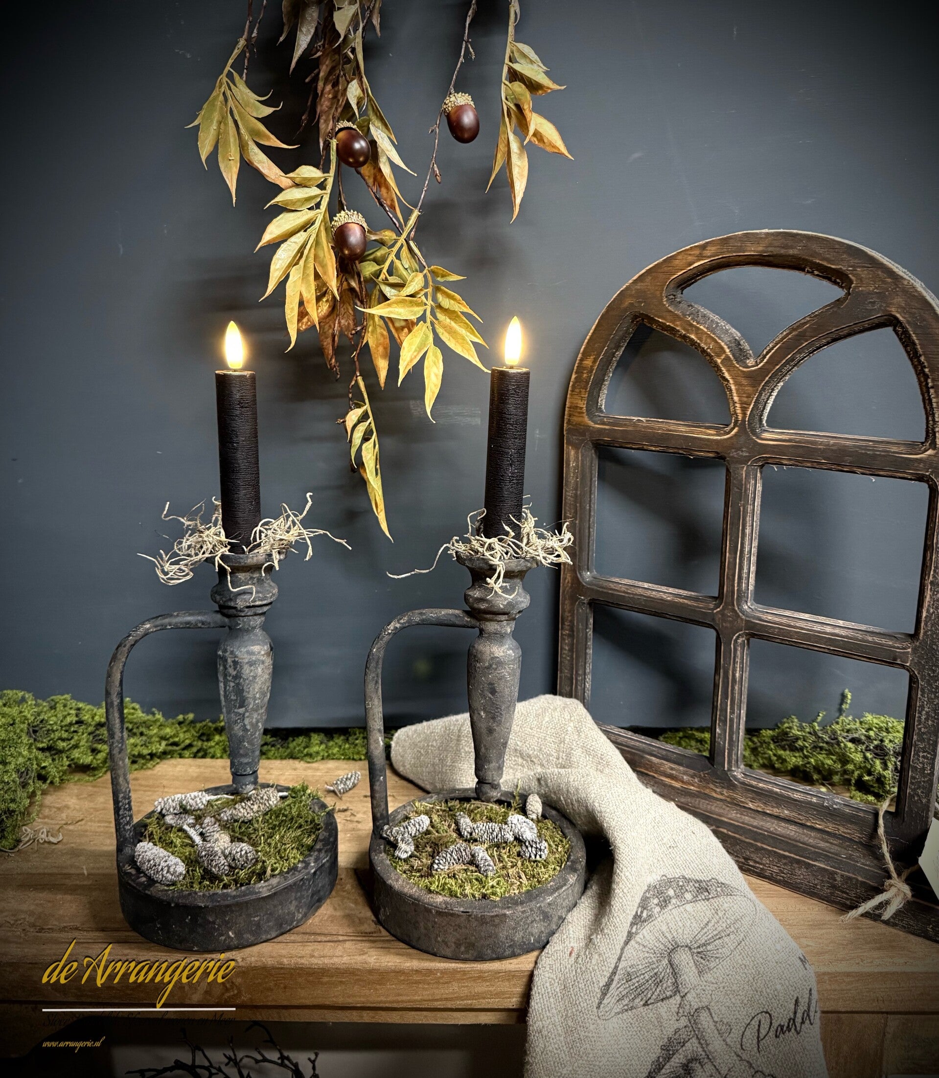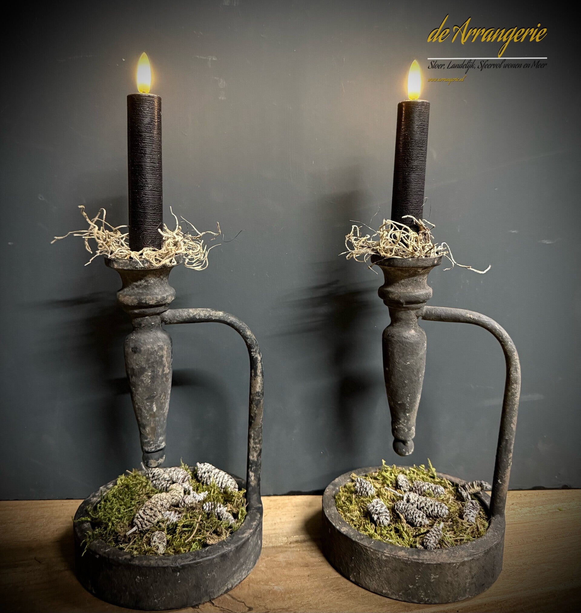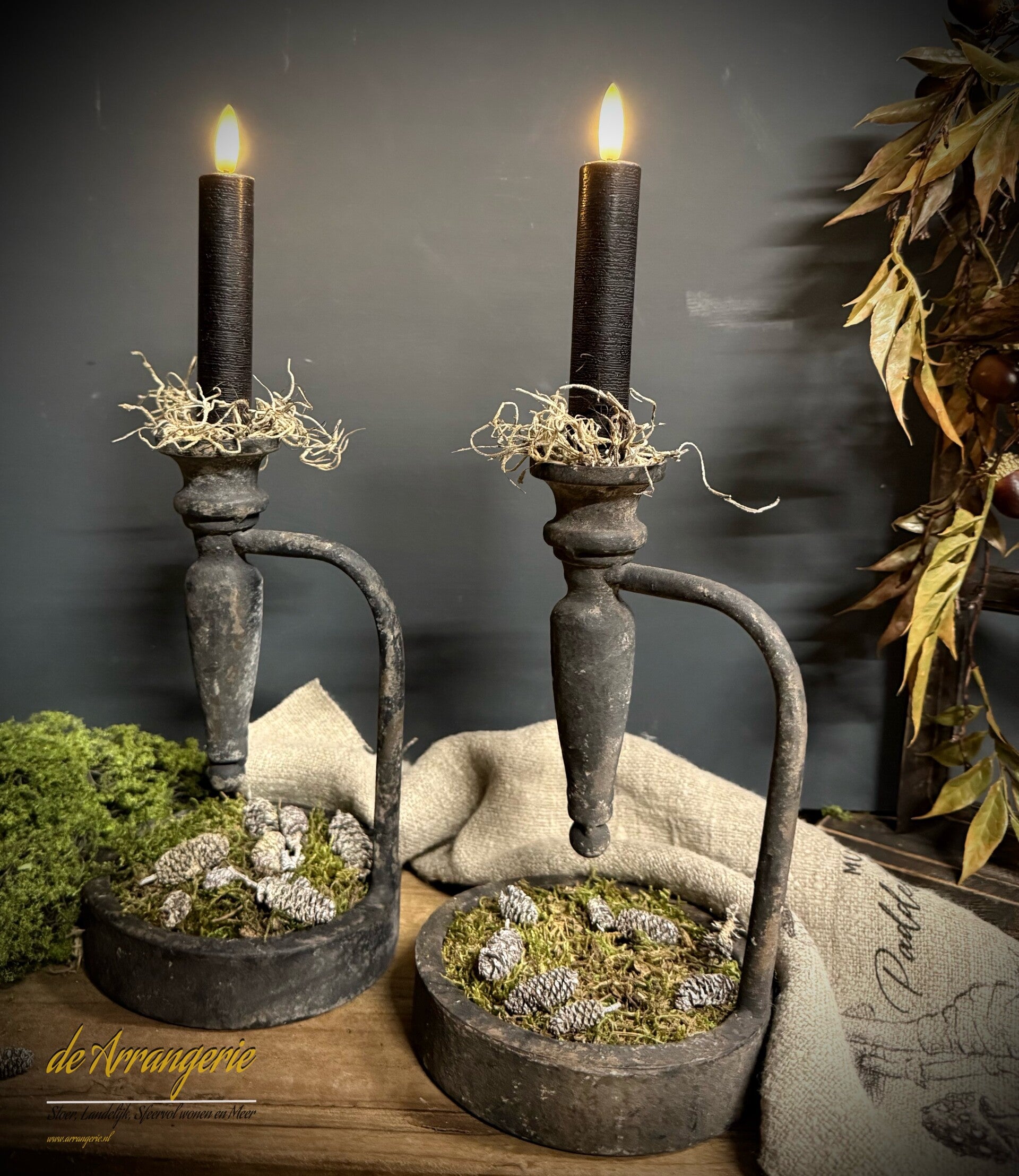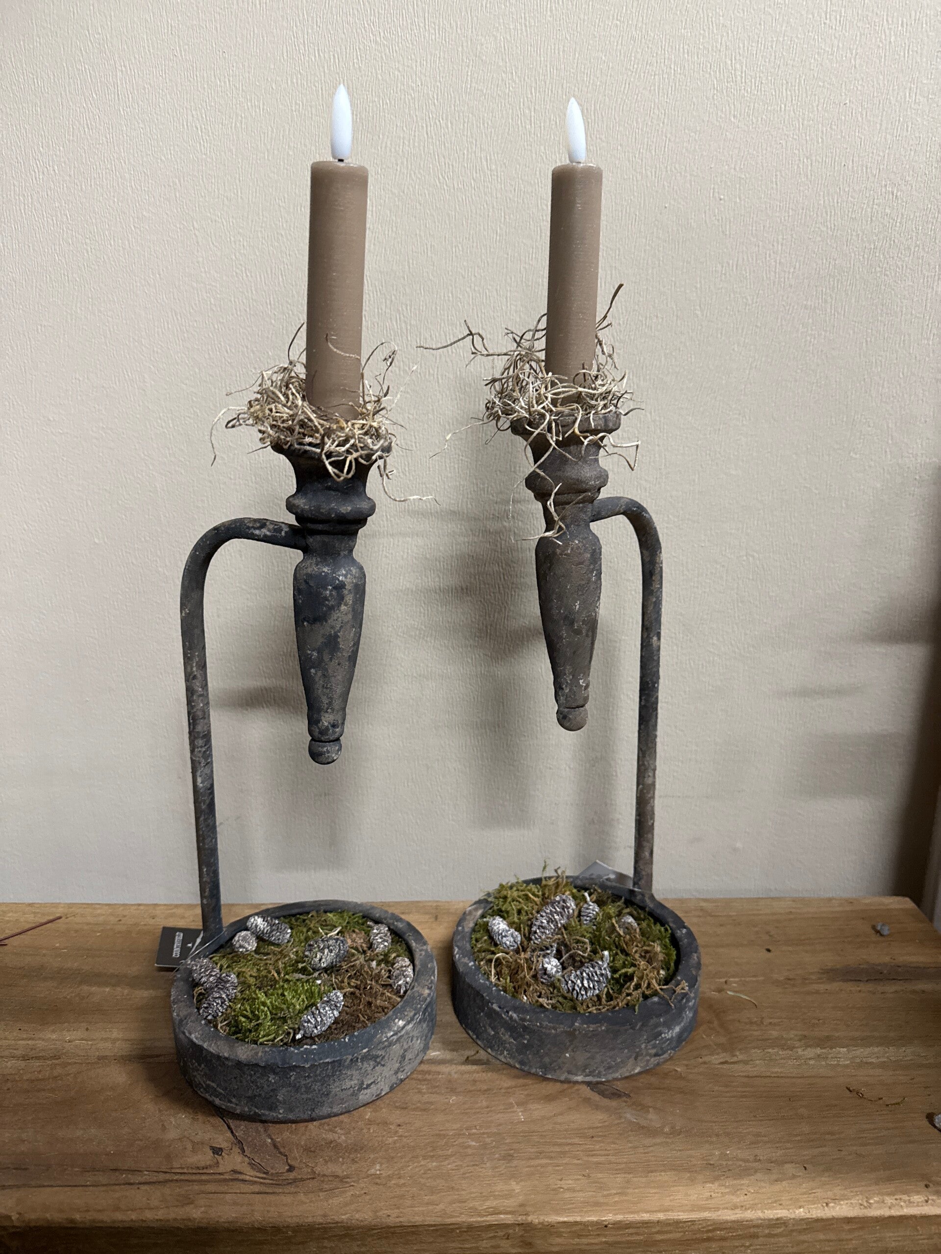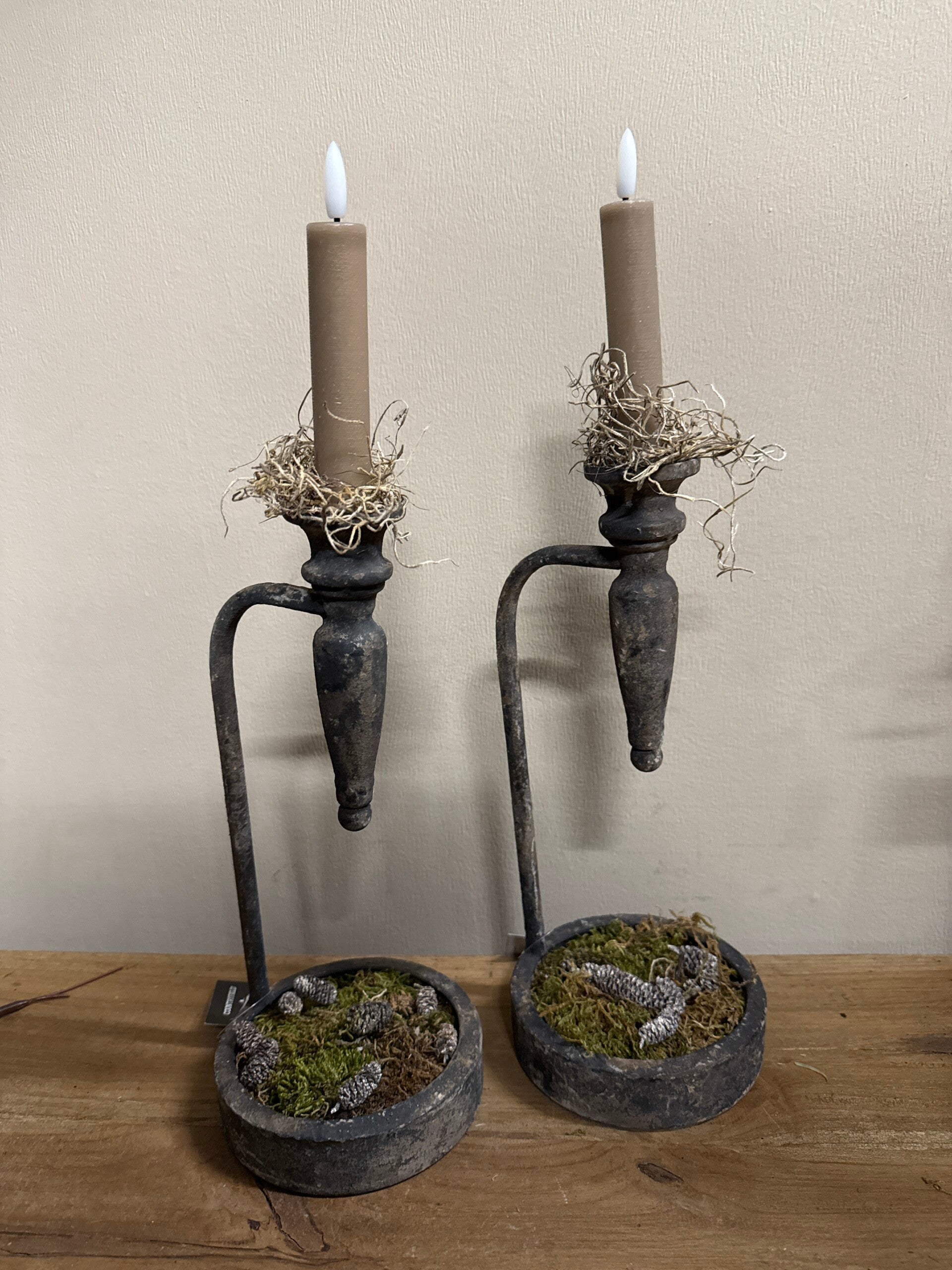 Op foto mos met dennenappeltjes in het bakje. Dit is per kandelaar bij te bestellen.