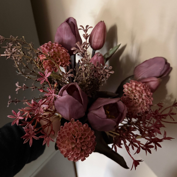 Boeketje van 7 tulpen in donker roze met pompon dahlia's en andere takjes . De stelen en blad van de tulpen zijn donker
