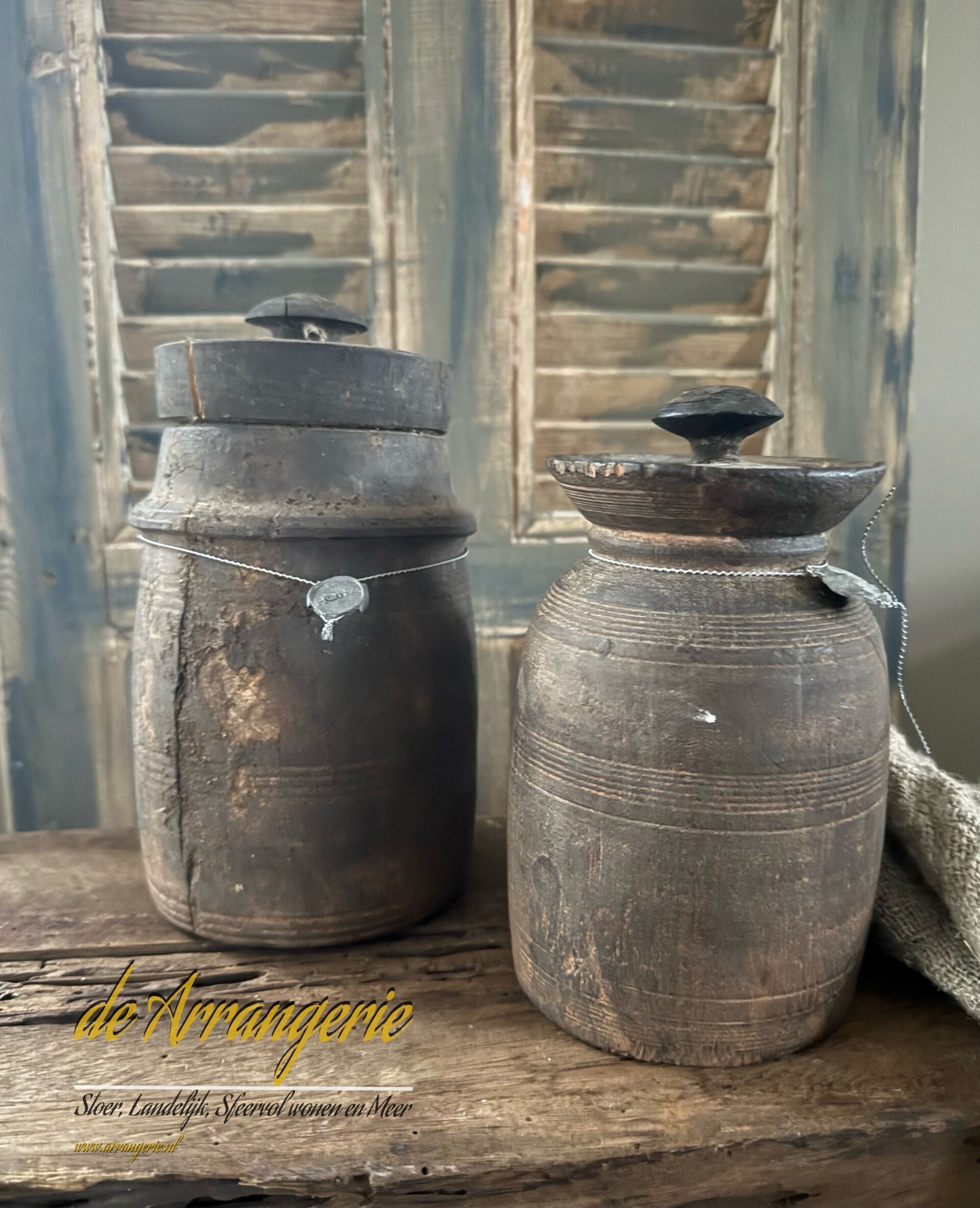 Prachtige oude houten pot met deksel van het merk Hoffz, handgemaakt in Nepal. De pot heeft een authentieke, doorleefde uitstraling met mooie donkere patina en karakteristieke groeven in het hout. Dit unieke decoratie-object staat sfeervol op een dressoir, kast of keukenplank en laat zich mooi combineren met andere sobere of landelijke accessoires.