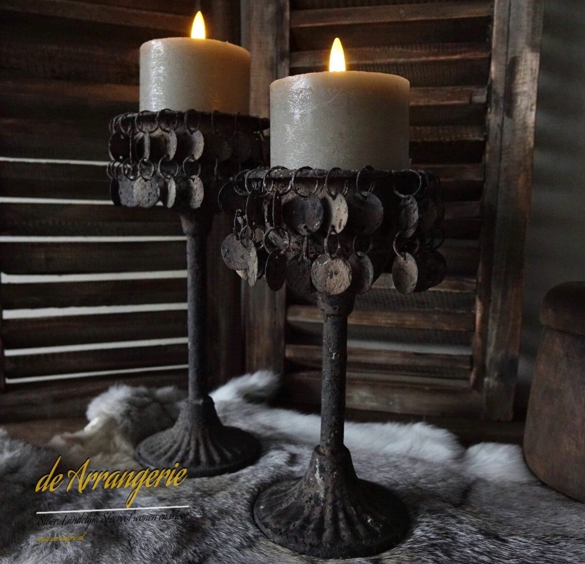 kandelaars met muntjes in roestkleur opgemaakt met een paasei en tillandsia