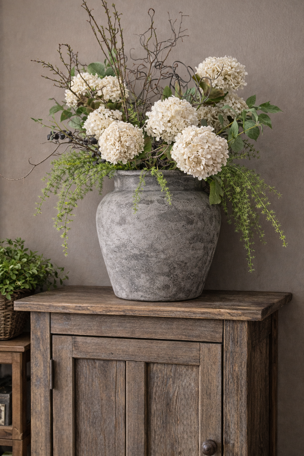 Tak met 3 witte hortensia’s (sneeuw bal)