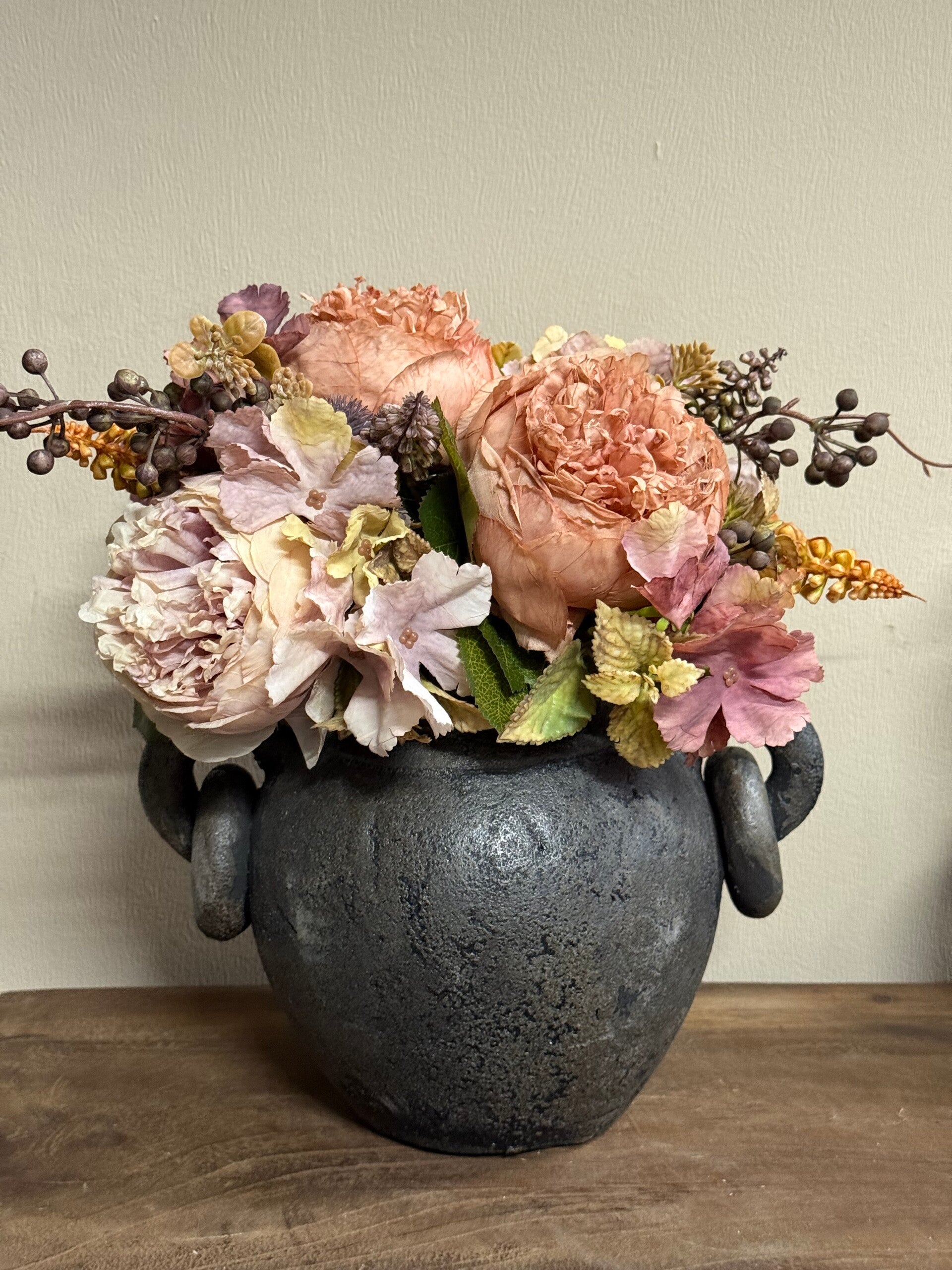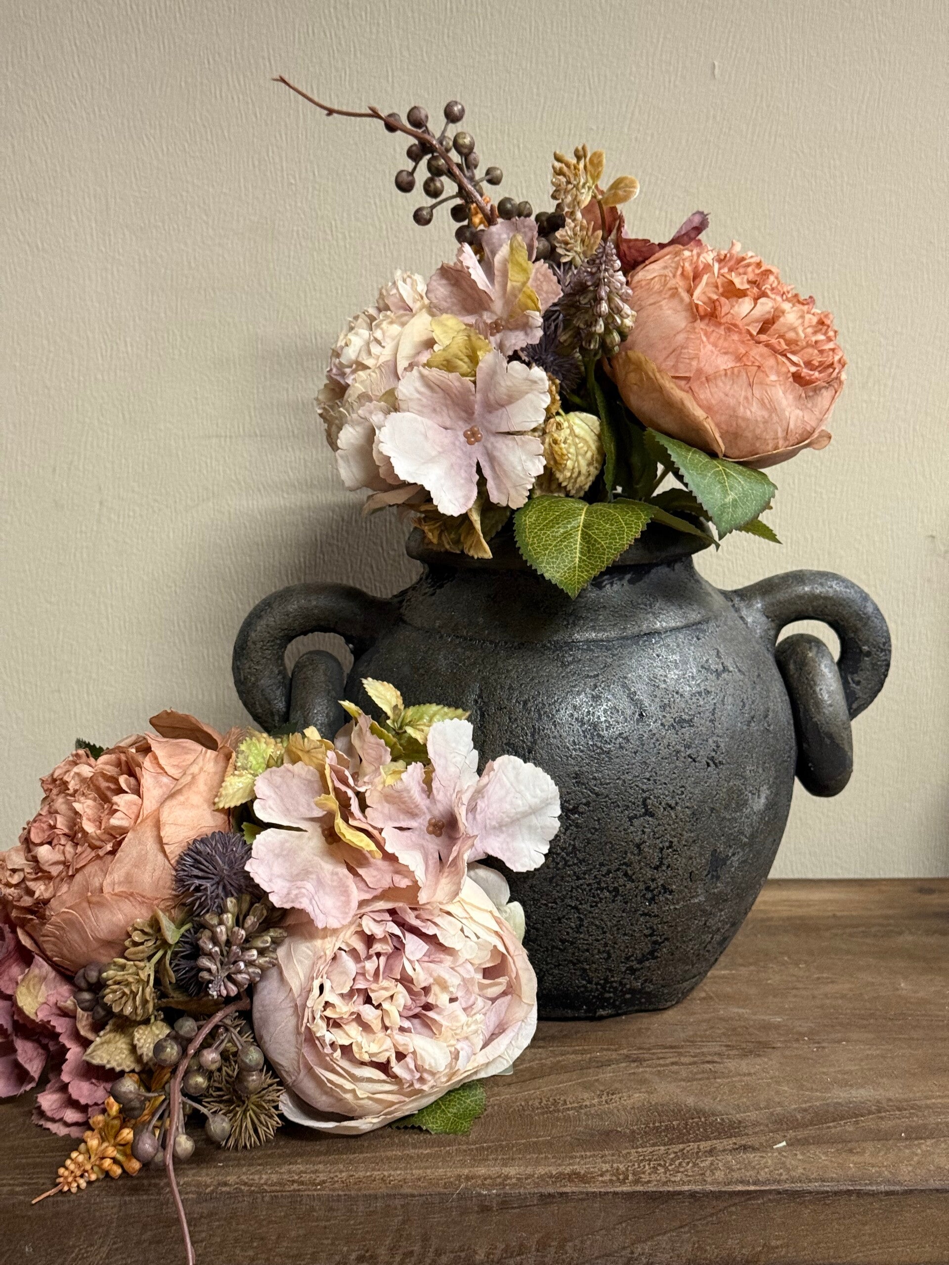 In deze pot staan 2 brynxz pioenroos boeketjes in oudroze/mauve