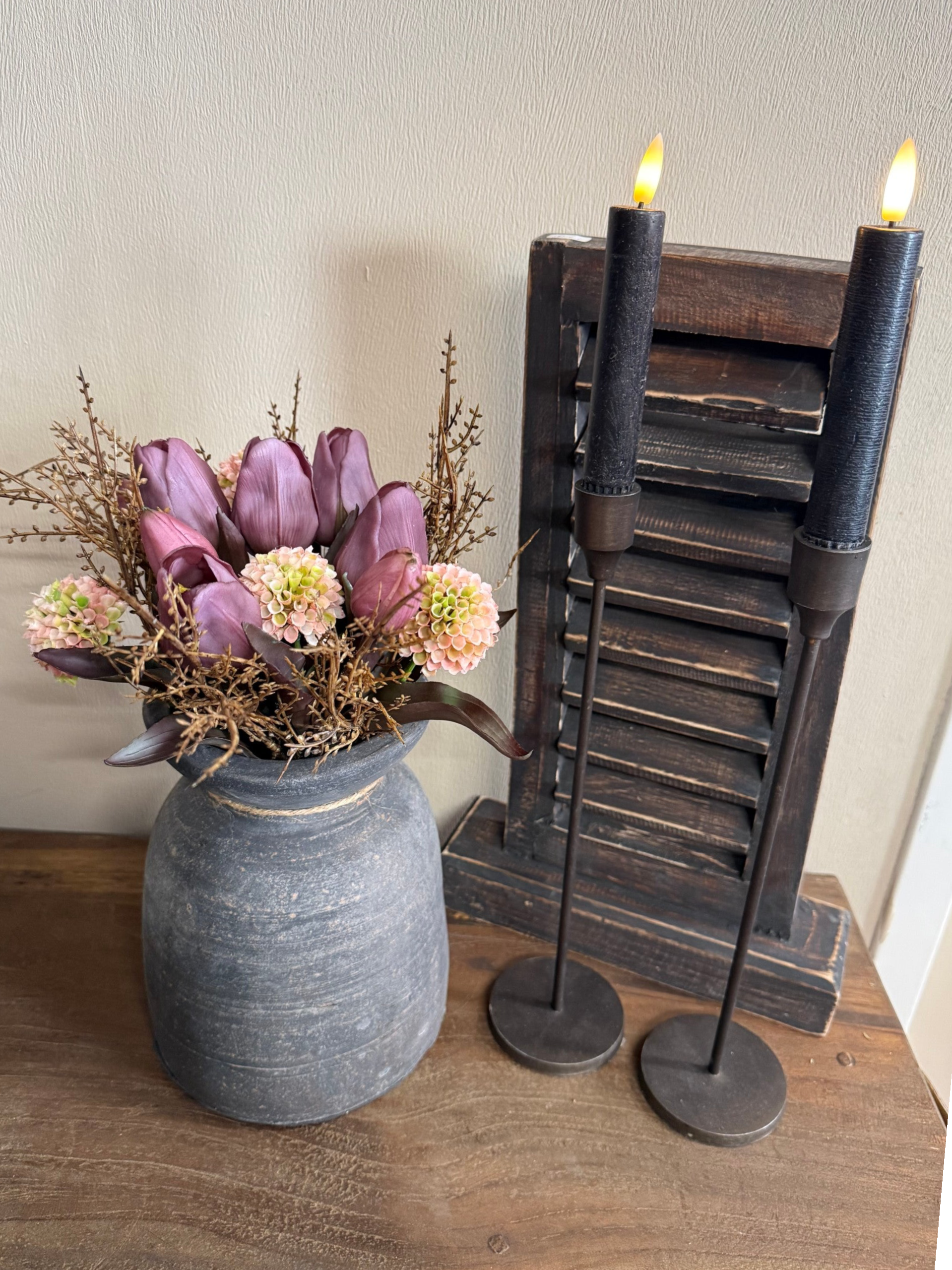 Sobere grijze pot met tulpen boeket